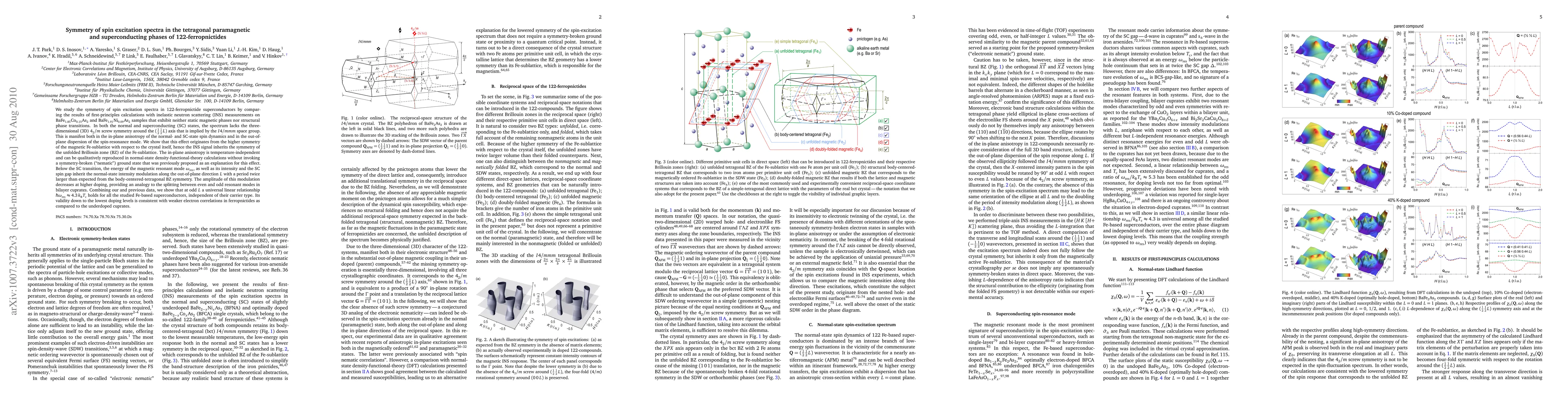 We study the symmetry of spin excitation spectra in 122-ferropnictide superconductors by comparing the results of first-principles calculations with inelastic neutron scattering (INS) measurements on BaFe1.85Co0.15As2 and BaFe1.91Ni0.09As2 samples that exhibit neither static magnetic phases nor structural phase transitions. In both the normal and superconducting (SC) states, the spectrum lacks the 42/m screw symmetry around the (1/2 1/2 L) axis that is implied by the I4/mmm space group. This is manifest both in the in-plane anisotropy of the normal- and SC-state spin dynamics and in the out-of-plane dispersion of the spin-resonance mode. We show that this effect originates from the higher symmetry of the magnetic Fe sublattice with respect to the crystal itself, hence the INS signal inherits the symmetry of the unfolded Brillouin zone (BZ) of the Fe sublattice. The in-plane anisotropy is temperature-independent and can be qualitatively reproduced in normal-state density-functional-theory calculations without invoking a symmetry-broken ("nematic") ground state that was previously proposed as an explanation for this effect. Below the SC transition, the energy of the magnetic resonant mode Er, as well as its intensity and the SC spin gap inherit the normal-state intensity modulation along the out-of-plane direction L with a period twice larger than expected from the body-centered-tetragonal BZ symmetry. The amplitude of this modulation decreases at higher doping, providing an analogy to the splitting between even and odd resonant modes in bilayer cuprates. Combining our and previous data, we show that at odd L a universal linear relationship Er=4.3*kB*Tc holds for all studied Fe-based superconductors, independent of their carrier type. Its validity down to the lowest doping levels is consistent with weaker electron correlations in ferropnictides as compared to the underdoped cuprates.