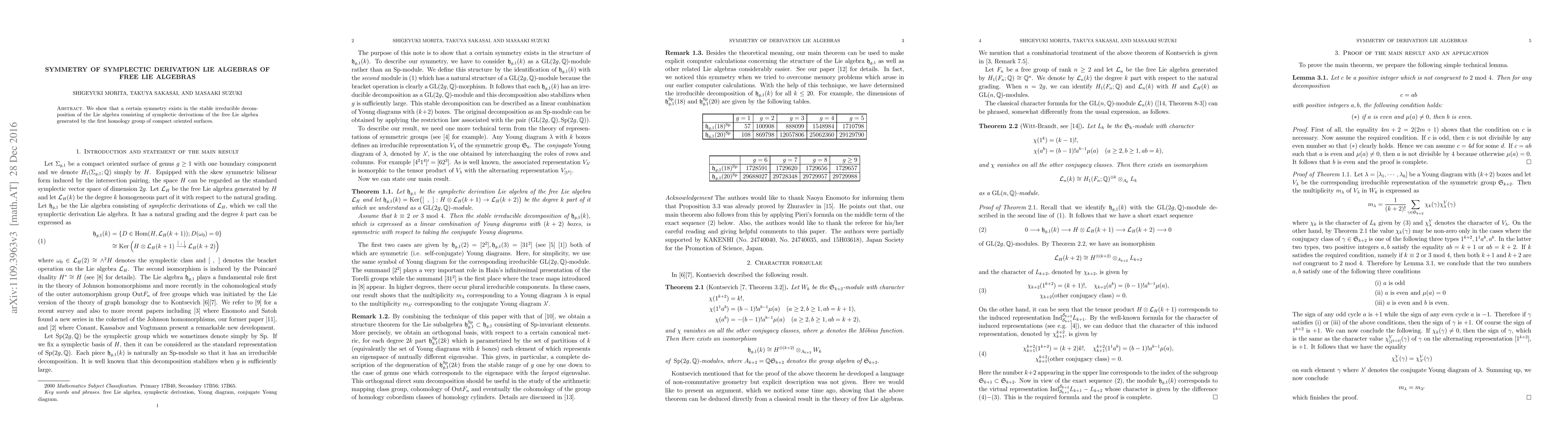 Summary: The research reveals a symmetry in the stable irreducible decomposition of the Lie algebra of symplectic derivations for free Lie algebras derived from the first homology group of compact oriented surfaces. This symmetry provides deeper insights into the structure of these derivations.