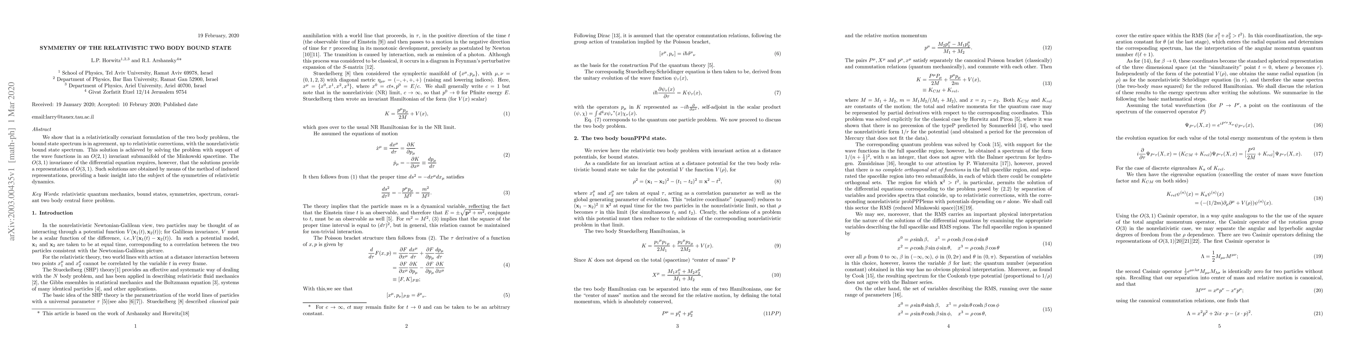 This paper demonstrates that the relativistic two-body bound state spectrum aligns with the non-relativistic spectrum, corrected for relativistic effects, by solving the problem within an O(2,1) invariant submanifold. The method of induced representations is used to achieve O(3,1) invariance, offering insights into relativistic dynamics symmetries.