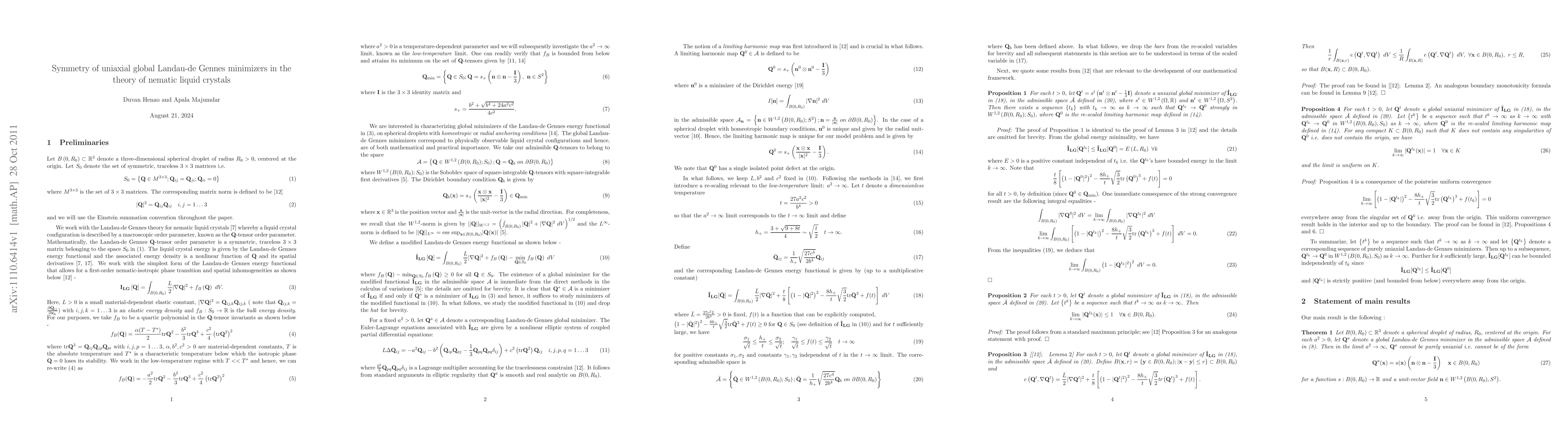 This paper investigates uniaxial energy minimizers in the Landau-de Gennes theory for nematic liquid crystals on a spherical droplet, revealing that they exhibit radial-hedgehog symmetry in the low-temperature regime. Consequently, it concludes that pure uniaxial configurations are impossible for sufficiently low temperatures.