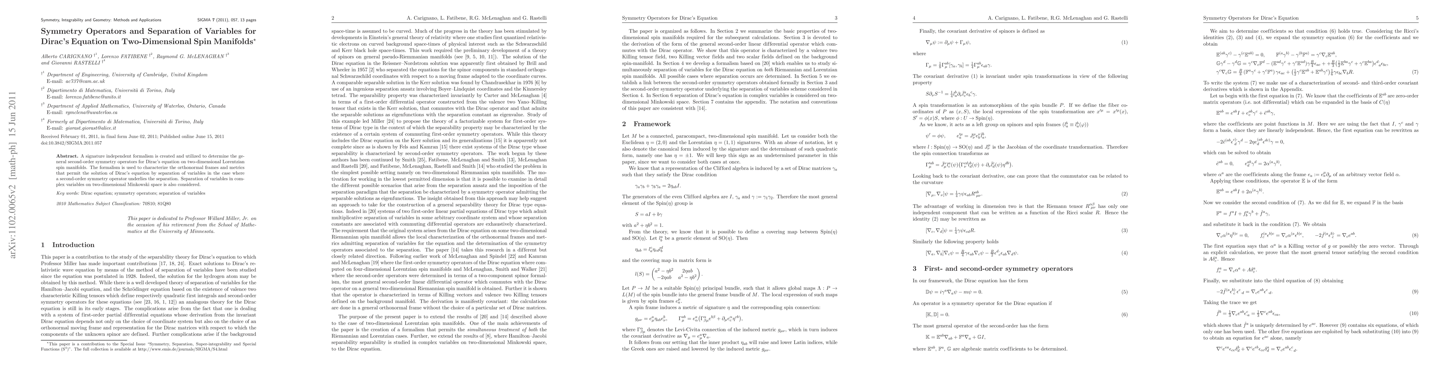 This paper develops a signature-independent formalism to identify general second-order symmetry operators for Dirac's equation on two-dimensional Lorentzian spin manifolds, enabling the separation of variables for solutions where such operators exist. It also explores the application of this method in two-dimensional Minkowski space.