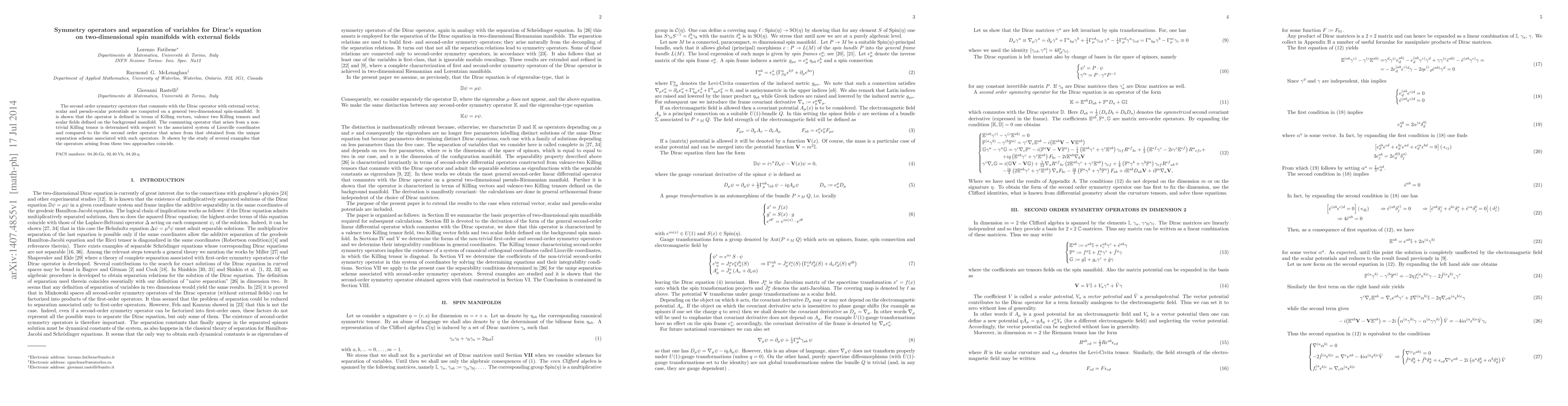 This paper computes second-order symmetry operators on two-dimensional spin manifolds with external fields, showing they are defined via Killing vectors and tensors. It demonstrates that these operators coincide with those derived from a unique separation scheme, validated through several examples.