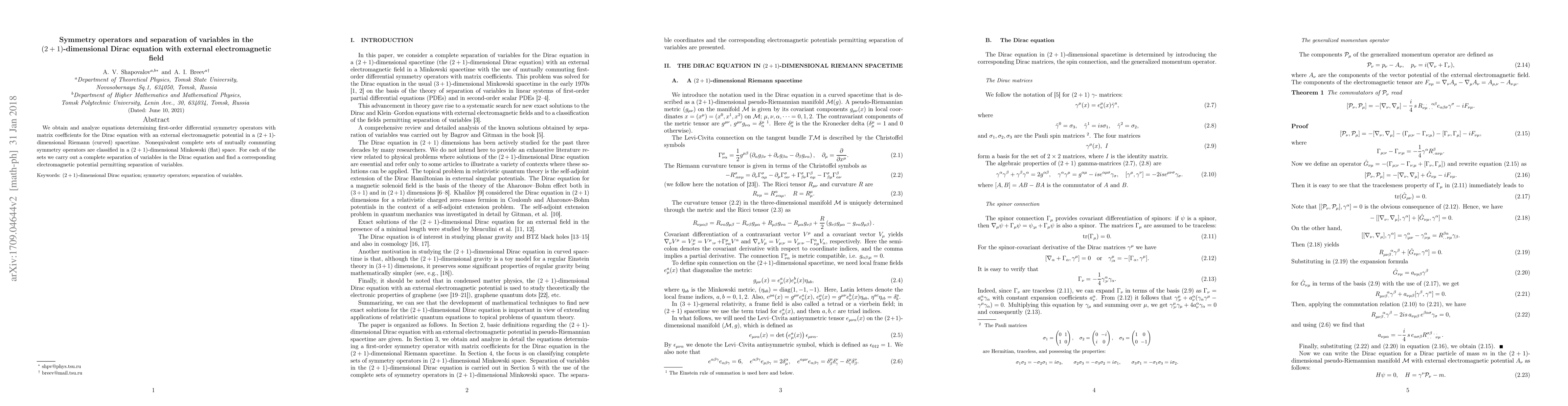 This paper classifies first-order differential symmetry operators for the $(2+1)$-dimensional Dirac equation with an external electromagnetic field, both in curved and flat spacetimes. It achieves complete separation of variables for each set of commuting symmetry operators, identifying corresponding electromagnetic potentials that allow for this separation.