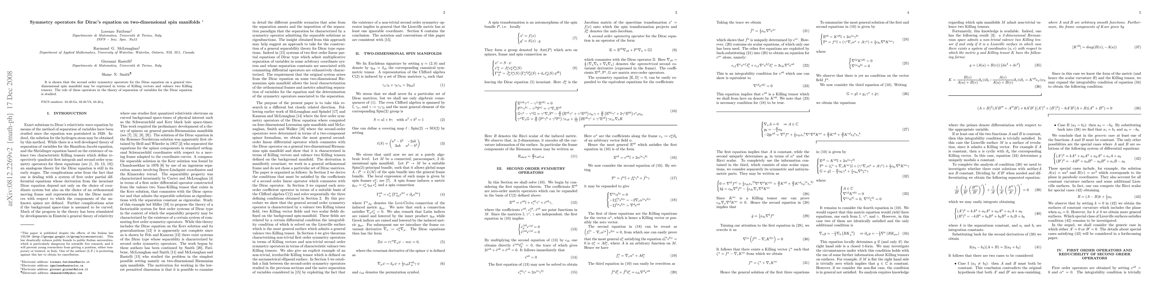 Summary: This paper demonstrates that second-order symmetry operators for the Dirac equation on two-dimensional spin manifolds can be represented using Killing vectors and valence two Killing tensors. It also explores their significance in the separation of variables for the Dirac equation.