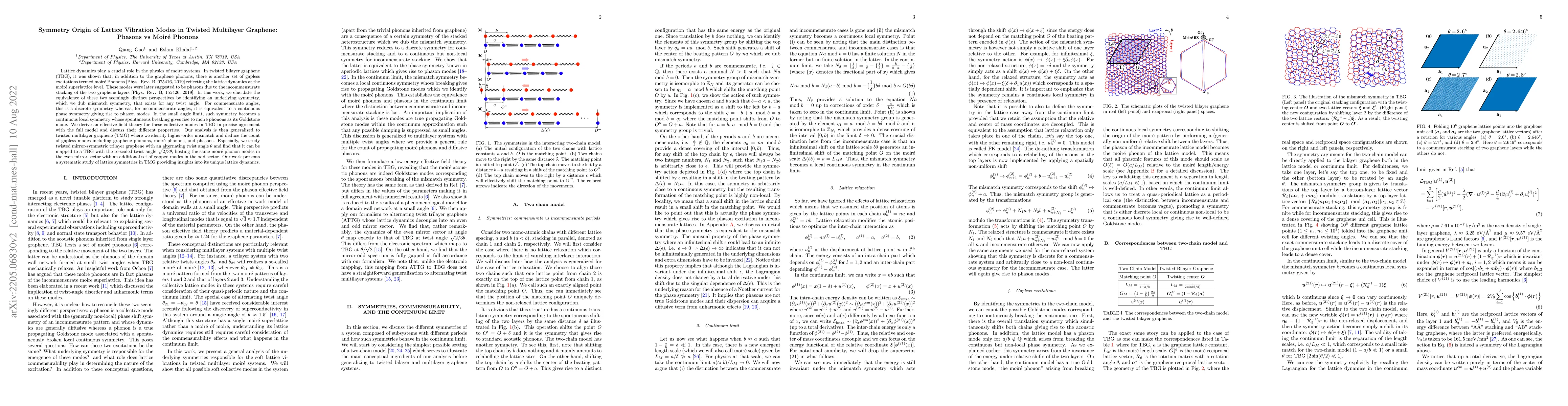 Lattice dynamics play a crucial role in the physics of Moir\'e systems. In twisted bilayer graphene (TBG), it was shown that, in addition to the graphene phonons, there is another set of gapless excitations termed Moir\'e Phonons [Phys. Rev. B, 075416, 2019] reflecting the lattice dynamics at the Moire superlattice level. These modes were later suggested to be phasons due to the incommensurate stacking of the two graphene layers [Phys. Rev. B, 155426, 2019]. In this work, we elucidate the equivalence of these two seemingly distinct perspectives by identifying an underlying symmetry, which we dub mismatch symmetry, that exists for any twist angle. For commensurate angles, this is a discrete symmetry whereas for incommensurate angles, it is equivalent to a continuous phase symmetry giving rise to phason modes. In the small angle limit, such symmetry becomes a continuous local symmetry whose spontaneous breaking gives rise to Moir\'e phonons as its Goldstone mode. We derive an effective field theory for these collective modes in TBG in precise agreement with the full model and discuss their different properties. Our analysis is then generalized to twisted multilayer graphene (TMG) where we identify higher order mismatch and deduce the count of gapless modes including graphene phonons, Moir\'e phonons and phasons. Especially, we study twisted mirror-symmetric trilayer graphene with an alternating twist angle $\theta$ and find that it can be mapped to a TBG with the re-scaled twist angle $\sqrt{2/3}\theta$, hosting the same Moir\'e phonon modes in the even mirror sector with an additional set of gapped modes in the odd sector. Our work presents a systematic study of lattice symmetries in TMG providing insights into its unique lattice dynamics.