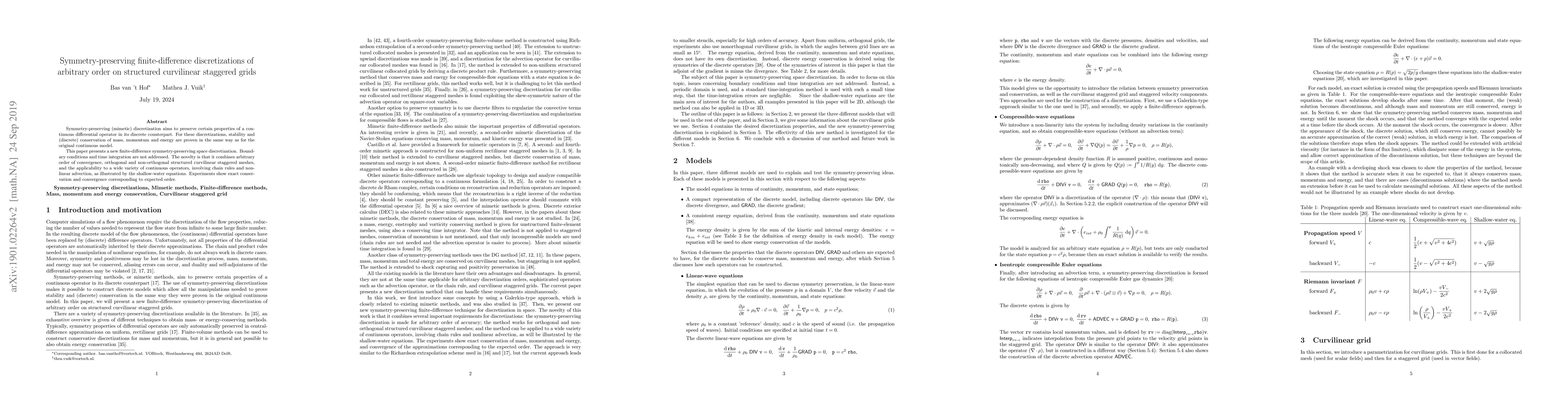 Symmetry-preserving (mimetic) discretization aims to preserve certain properties of a continuous differential operator in its discrete counterpart. For these discretizations, stability and (discrete) conservation of mass, momentum and energy are proven in the same way as for the original continuous model. This paper presents a new finite-difference symmetry-preserving space discretization. Boundary conditions and time integration are not addressed. The novelty is that it combines arbitrary order of convergence, orthogonal and non-orthogonal structured curvilinear staggered meshes, and the applicability to a wide variety of continuous operators, involving chain rules and nonlinear advection, as illustrated by the shallow-water equations. Experiments show exact conservation and convergence corresponding to expected order.