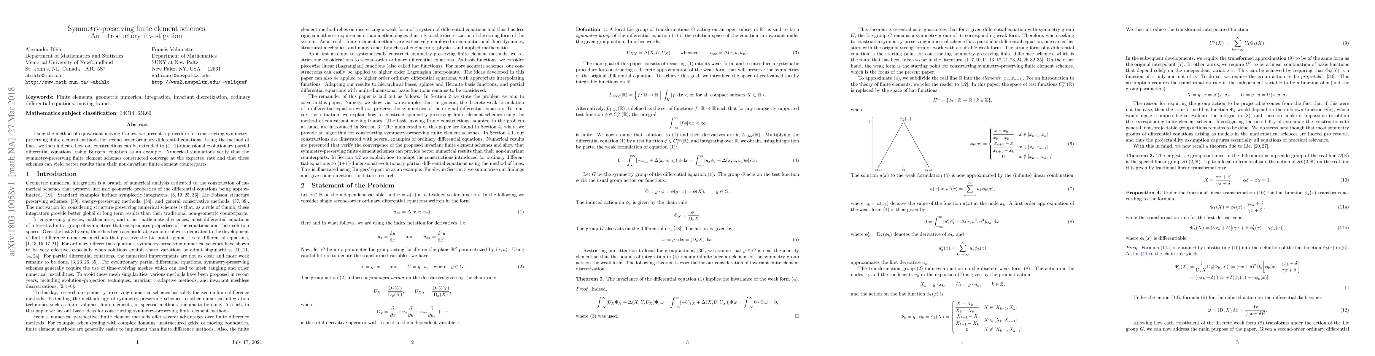 This paper introduces a method for constructing symmetry-preserving finite element schemes using equivariant moving frames for second-order ODEs and extends it to evolutionary PDEs via the method of lines, exemplified by Burgers' equation. Numerical simulations confirm the expected convergence rate and improved performance compared to non-invariant methods.
