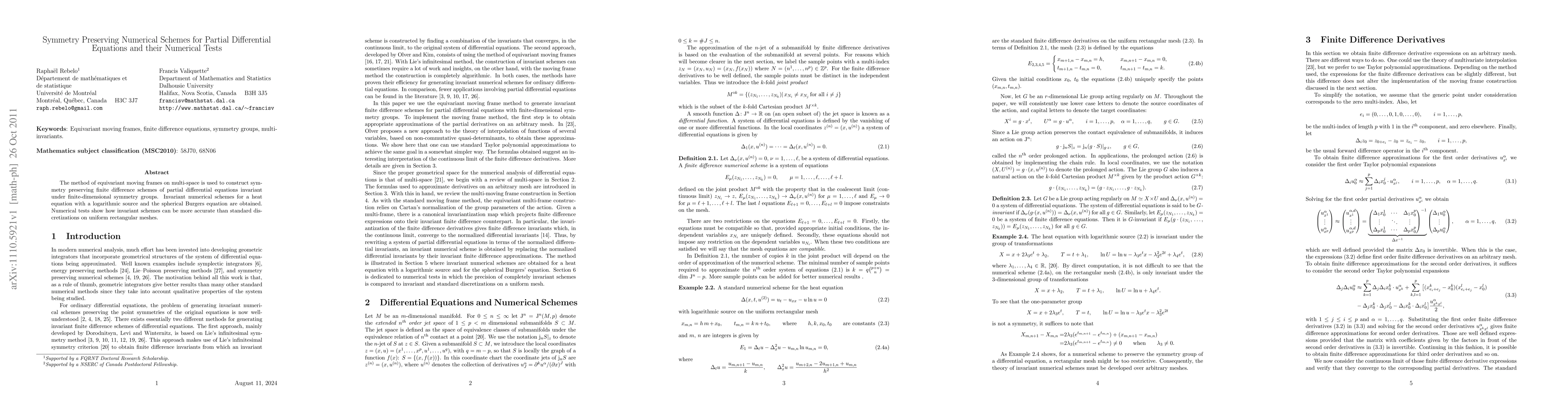 This paper constructs symmetry preserving finite difference schemes for partial differential equations using equivariant moving frames, demonstrating their accuracy through numerical tests on a heat equation and the spherical Burgers equation, showing improved accuracy compared to standard discretizations.