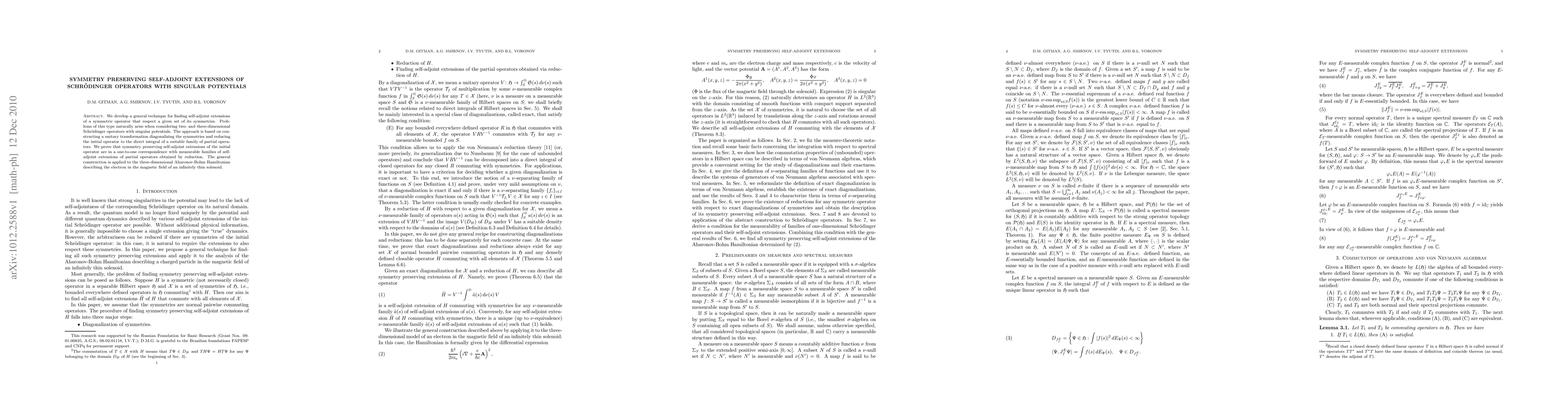 This paper presents a method for finding self-adjoint extensions of symmetric Schrödinger operators with singular potentials that preserve given symmetries. It constructs a unitary transformation to diagonalize symmetries and links these extensions to measurable families of self-adjoint extensions of reduced partial operators, exemplified through the Aharonov-Bohm Hamiltonian.