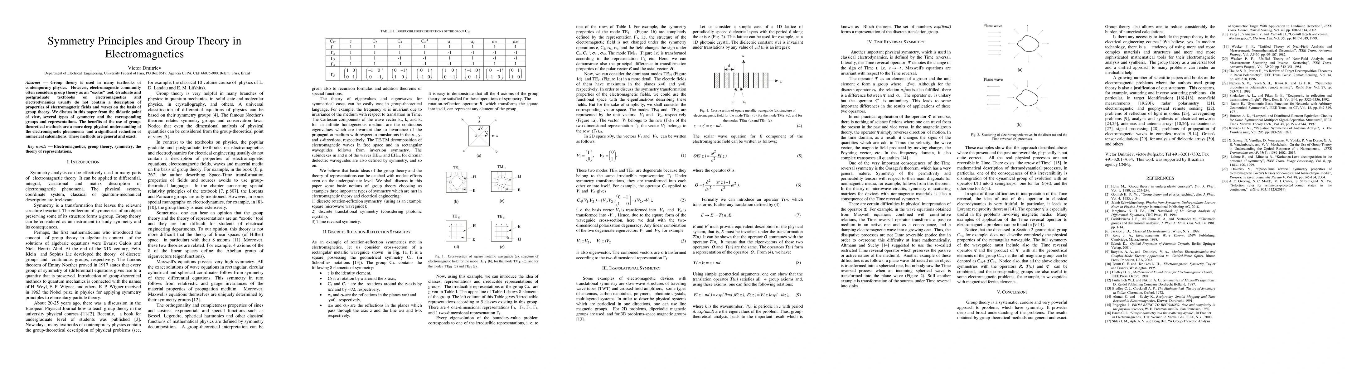 Group theory is used in many textbooks of contemporary physics. However, electromagnetic community often considers group theory as an "exotic" tool. Graduate and postgraduate textbooks on electromagnetics and electrodynamics usually do not contain a description of properties of electromagnetic fields and waves on the basis of group theory. We discuss in this paper from the didactic point of view, several types of symmetry and the corresponding groups and representations. The benefits of the use of group theoretical methods are a more deep physical understanding of the electromagnetic phenomena and a significant reduction of numerical calculations. These methods are general and exact.