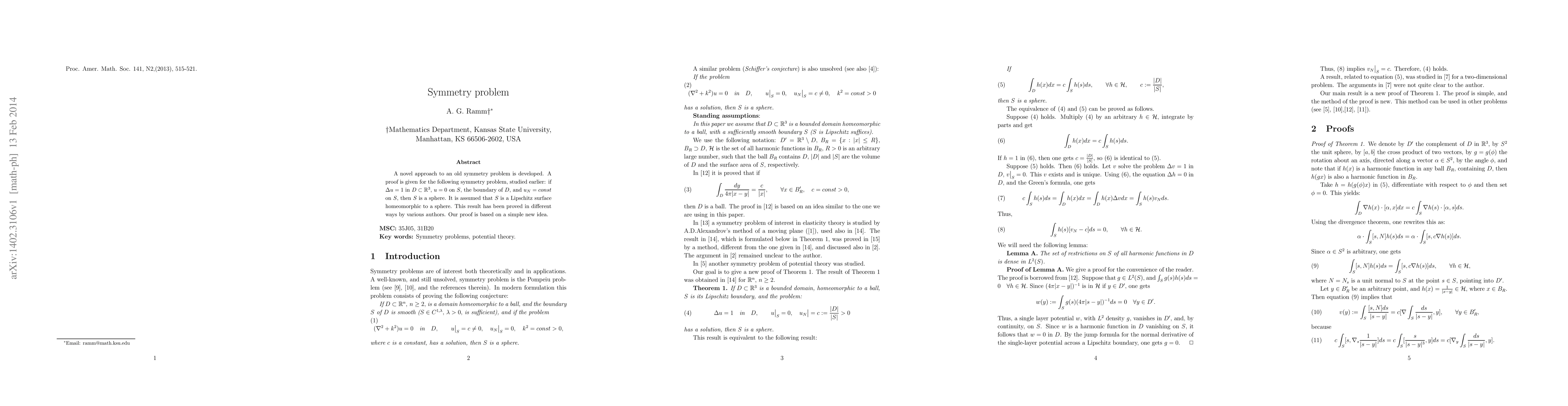 A novel approach to an old symmetry problem is developed. A new proof is given for the following symmetry problem, studied earlier.