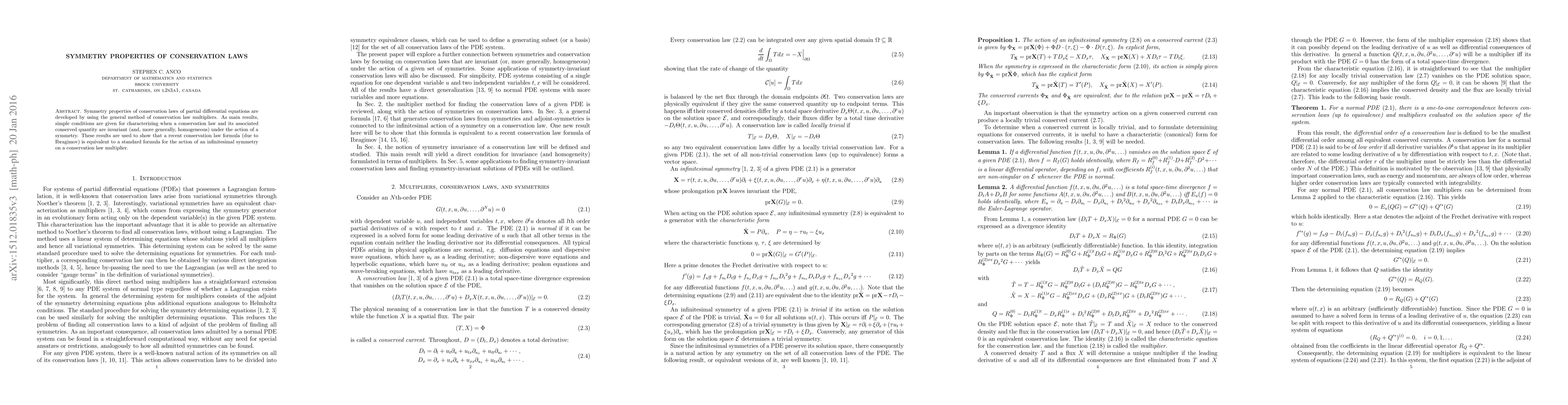 This paper develops symmetry properties of conservation laws for partial differential equations using conservation law multipliers. It provides conditions for invariance and homogeneity under symmetry actions, and demonstrates the equivalence of a recent conservation law formula to a standard infinitesimal symmetry formula.