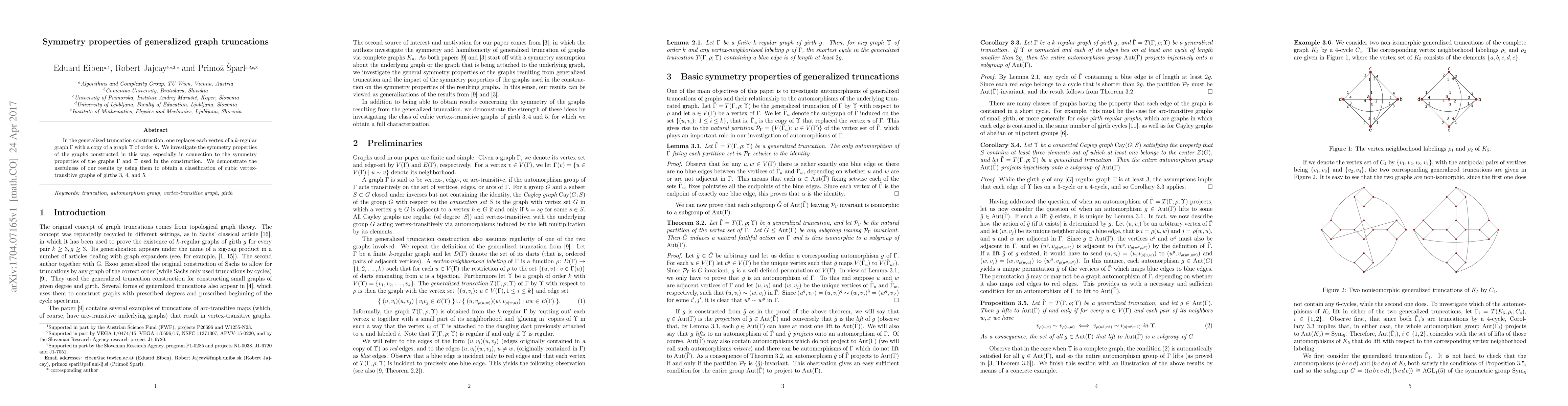The paper investigates the symmetry properties of generalized graph truncations, specifically focusing on cubic vertex-transitive graphs of girths 3, 4, and 5.