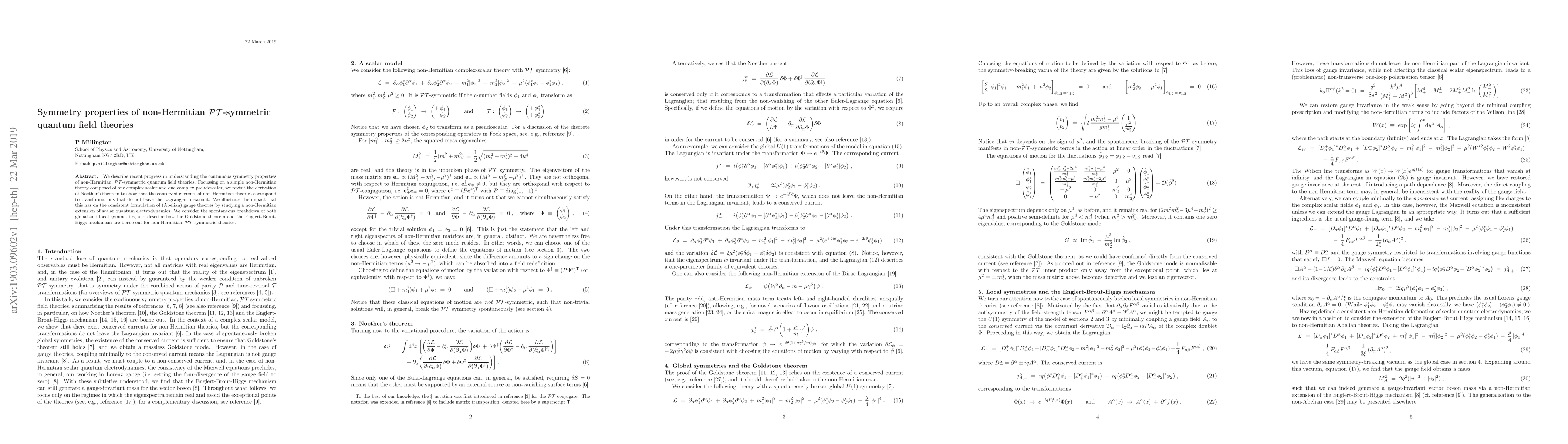 We describe recent progress in understanding the continuous symmetry properties of non-Hermitian, PT-symmetric quantum field theories. Focussing on a simple non-Hermitian theory composed of one complex scalar and one complex pseudoscalar, we revisit the derivation of Noether's theorem to show that the conserved currents of non-Hermitian theories correspond to transformations that do not leave the Lagrangian invariant. We illustrate the impact that this has on the consistent formulation of (Abelian) gauge theories by studying a non-Hermitian extension of scalar quantum electrodynamics. We consider the spontaneous breakdown of both global and local symmetries, and describe how the Goldstone theorem and the Englert-Brout-Higgs mechanism are borne out for non-Hermitian, PT-symmetric theories.