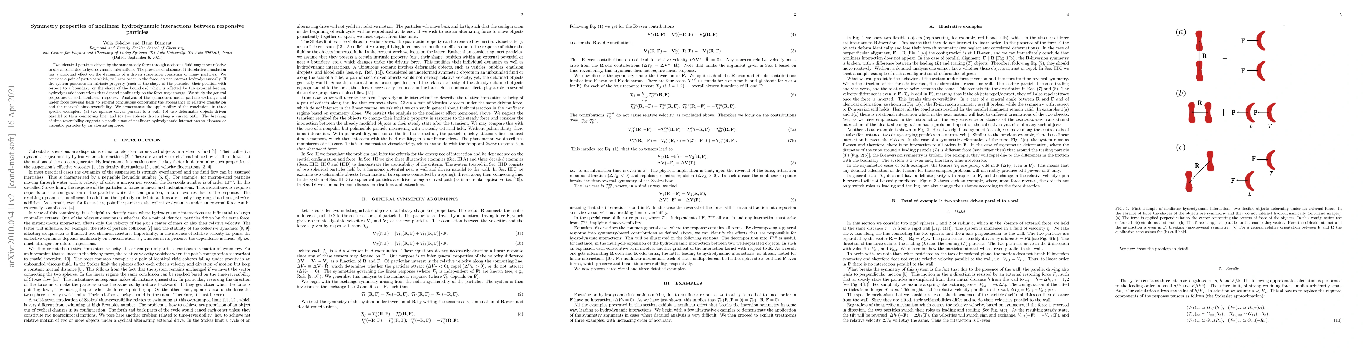 This paper investigates the symmetry properties of nonlinear hydrodynamic interactions in responsive particles driven through a viscous fluid, focusing on scenarios where relative translation and time-reversibility are affected. It demonstrates the implications of these interactions in three specific examples, suggesting potential applications in particle dispersion or assembly.
