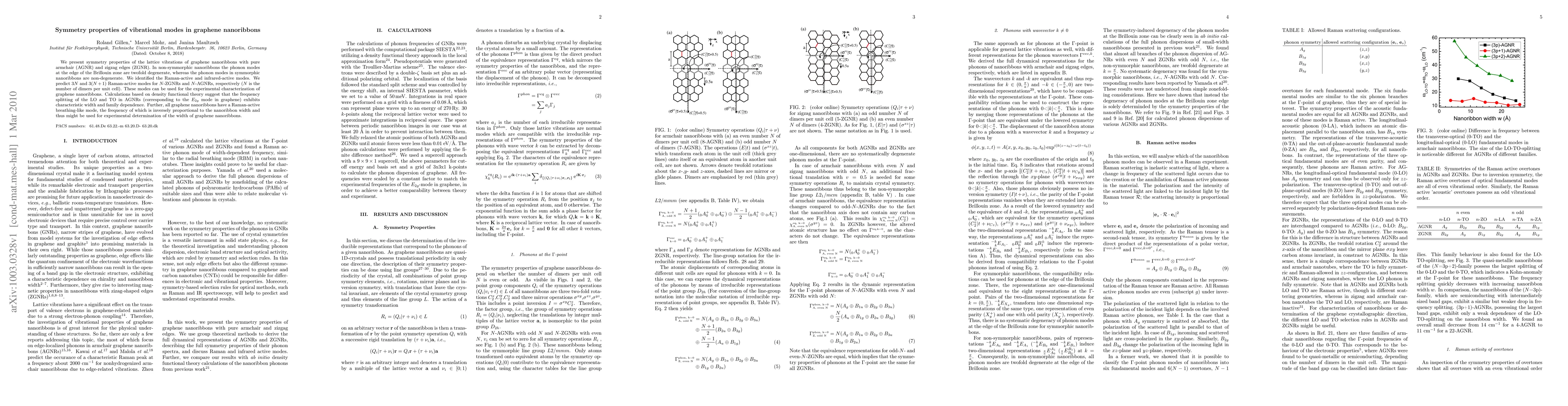 This research examines the symmetry properties and vibrational modes of graphene nanoribbons, revealing that phonon modes in non-symmorphic nanoribbons are degenerate, while symmorphic ones are not. It identifies Raman-active and infrared-active modes, and proposes methods for experimental characterization using these modes, including a width-dependent breathing-like Raman mode.
