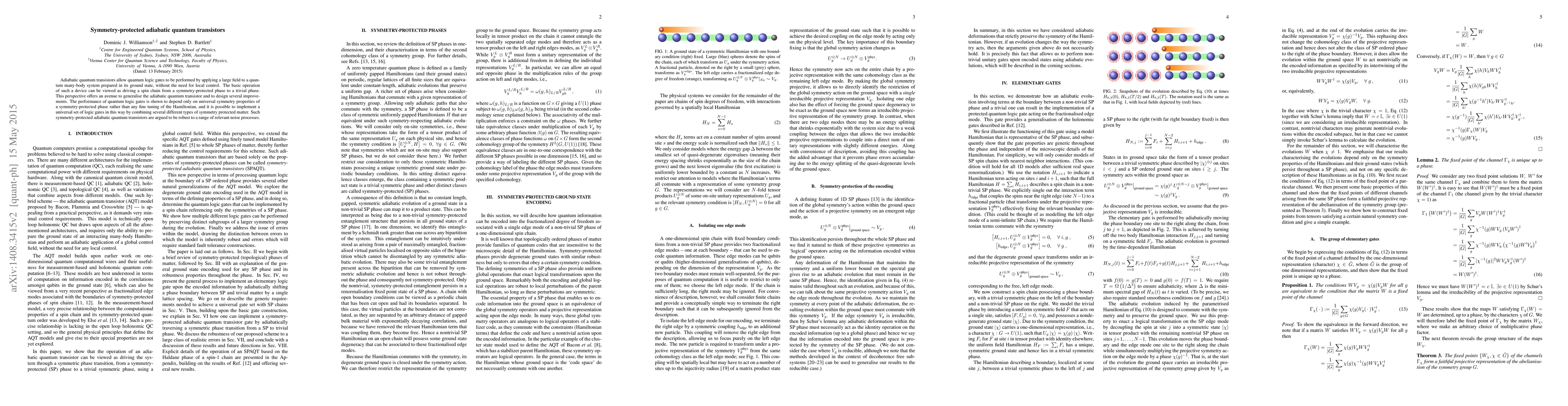 Adiabatic quantum transistors allow quantum logic gates to be performed by applying a large field to a quantum many-body system prepared in its ground state, without the need for local control. The basic operation of such a device can be viewed as driving a spin chain from a symmetry protected phase to a trivial phase, and this perspective offers an avenue to generalise the adiabatic quantum transistor and to design several improvements. The performance of quantum logic gates is shown to depend only on universal symmetry properties of a symmetry-protected phase rather than fine tuned parent Hamiltonians, and it is possible to implement a universal set of logic gates in this way by combining several different types of symmetry protected matter. Such symmetry-protected adiabatic quantum transistors are argued to be robust to a range of relevant noise processes.