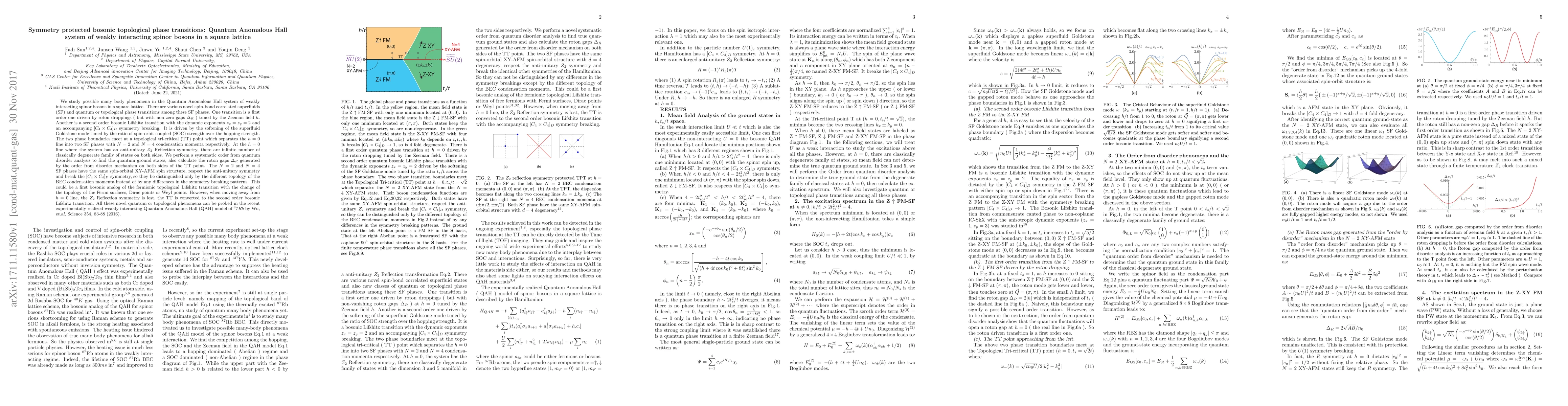 We study possible many body phenomena in the Quantum Anomalous Hall system of weakly interacting spinor bosons in a square lattice. There are various novel spin-bond correlated superfluids (SF) and quantum or topological phase transitions among these SF phases. One transition is a first order one driven by roton droppings ( but with non-zero gaps $ \Delta_R $ ) tuned by the Zeeman field $ h $. Another is a second order bosonic Lifshitz transition with the dynamic exponents $ z_x=z_y=2 $ and an accompanying $ [C_4 \times C_4]_D $ symmetry breaking. It is driven by the softening of the superfluid Goldstone mode tuned by the ratio of spin-orbit coupled (SOC) strength over the hopping strength. The two phase boundaries meet at a topological tri-critical (TT) point which separates the $ h=0 $ line into two SF phases with $ N=2 $ and $ N=4 $ condensation momenta respectively. At the $ h=0 $ line where the system has an anti-unitary $ Z_2 $ Reflection symmetry, there are infinite number of classically degenerate family of states on both sides. We perform a systematic order from quantum disorder analysis to find the quantum ground states, also calculate the roton gaps $ \Delta_R $ generated by the order from disorder mechanism on both sides of the TT point. The $ N=2 $ and $ N=4 $ SF phases have the same spin-orbital XY-AFM spin structure, respect the anti-unitary symmetry and break the $ [C_4 \times C_4]_D $ symmetry, so they be distinguished only by the different topology of the BEC condensation momenta instead of by any differences in the symmetry breaking patterns. All these novel quantum or topological phenomena can be probed in the recent experimentally realized weakly interacting Quantum Anomalous Hall (QAH) model of $ ^87 Rb $ by Wu, {\sl et.al}, Science 354, 83-88 (2016).