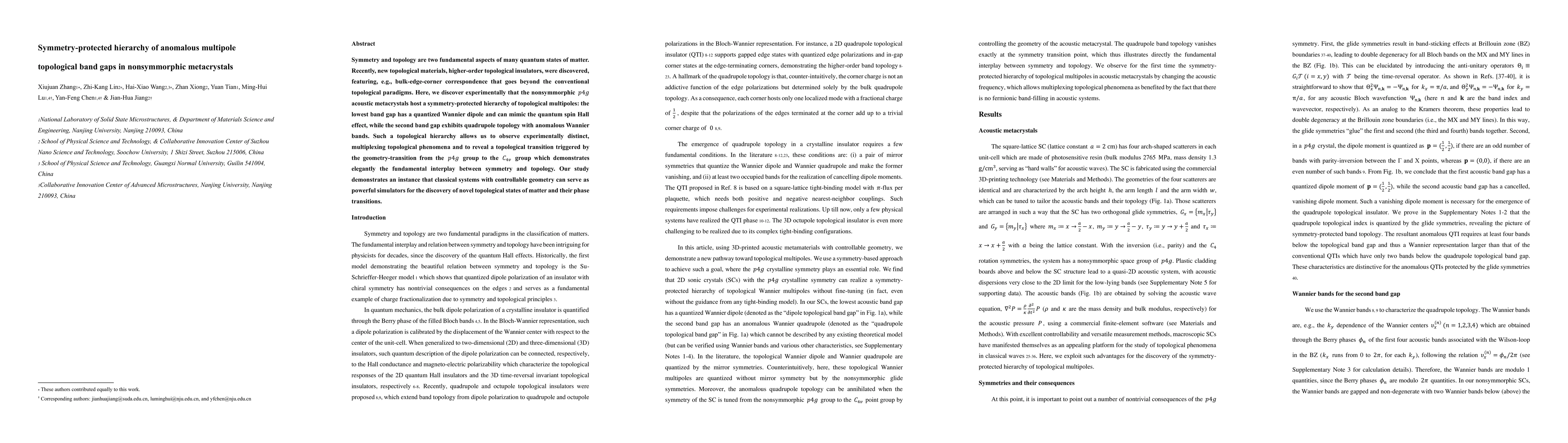 Symmetry and topology are two fundamental aspects of many quantum states of matter. Recently, new topological materials, higher-order topological insulators, were discovered, featuring, e.g., bulk-edge-corner correspondence that goes beyond the conventional topological paradigms. Here, we discover experimentally that the nonsymmorphic $p4g$ acoustic metacrystals host a symmetry-protected hierarchy of topological multipoles: the lowest band gap has a quantized Wannier dipole and can mimic the quantum spin Hall effect, while the second band gap exhibits quadrupole topology with anomalous Wannier bands. Such a topological hierarchy allows us to observe experimentally distinct, multiplexing topological phenomena and to reveal a topological transition triggered by the geometry-transition from the $p4g$ group to the $C_{4v}$ group which demonstrates elegantly the fundamental interplay between symmetry and topology. Our study demonstrates an instance that classical systems with controllable geometry can serve as powerful simulators for the discovery of novel topological states of matter and their phase transitions.