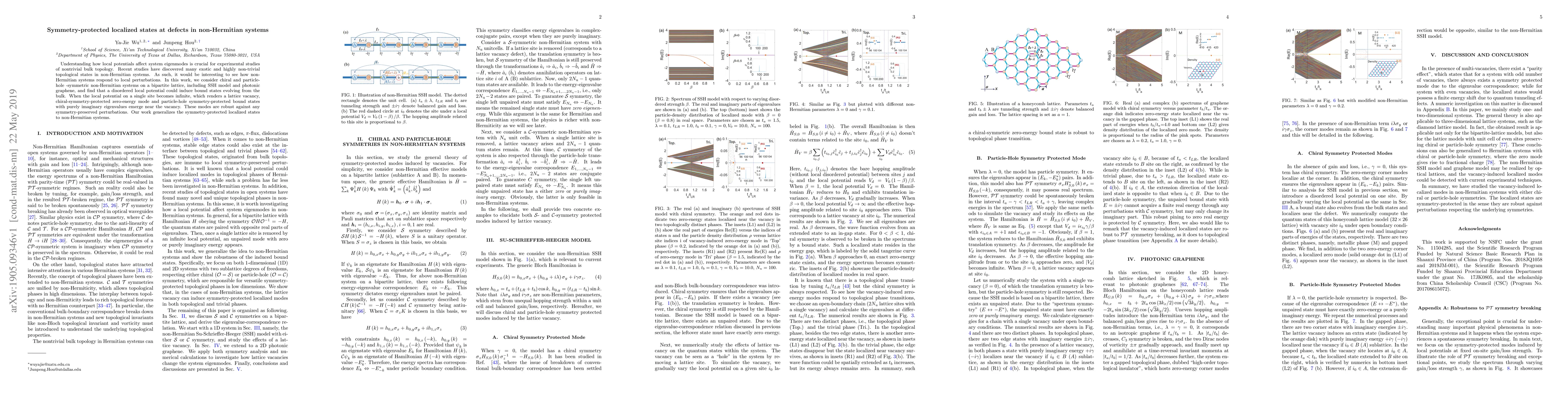 This paper explores how local perturbations, such as lattice vacancies, induce symmetry-protected localized states in non-Hermitian systems, including the SSH model and photonic graphene. It finds that chiral-symmetry and particle-hole symmetry protect zero-energy and purely imaginary eigenvalue bound states, respectively, which remain robust against symmetry-preserving perturbations.