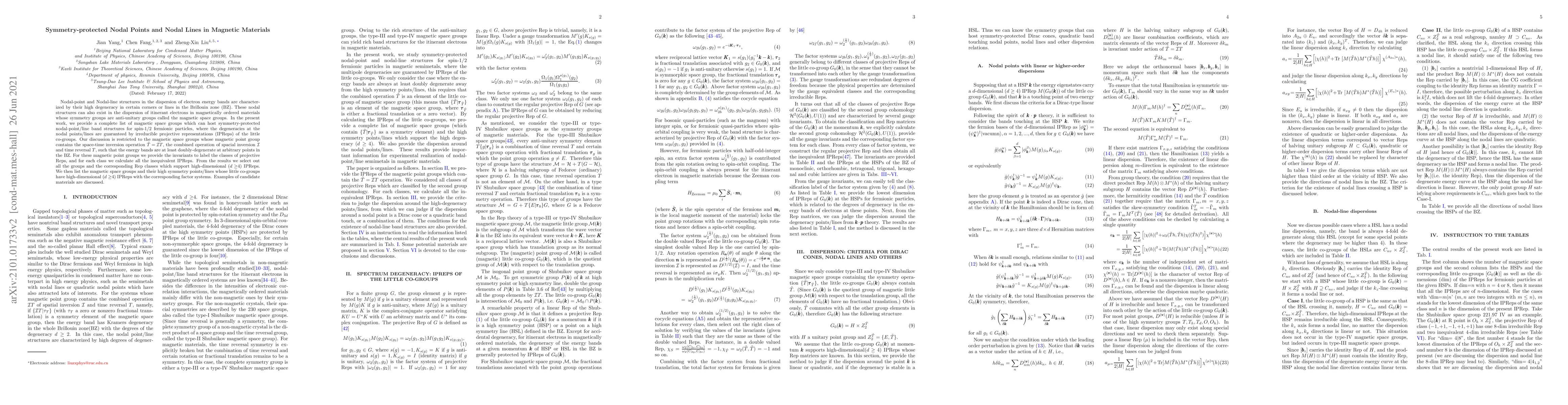 This paper catalogs magnetic space groups that can host symmetry-protected nodal-point and nodal-line structures in magnetic materials, ensuring degeneracies via irreducible projective representations. The study focuses on groups supporting high-dimensional projective representations and discusses potential candidate materials.