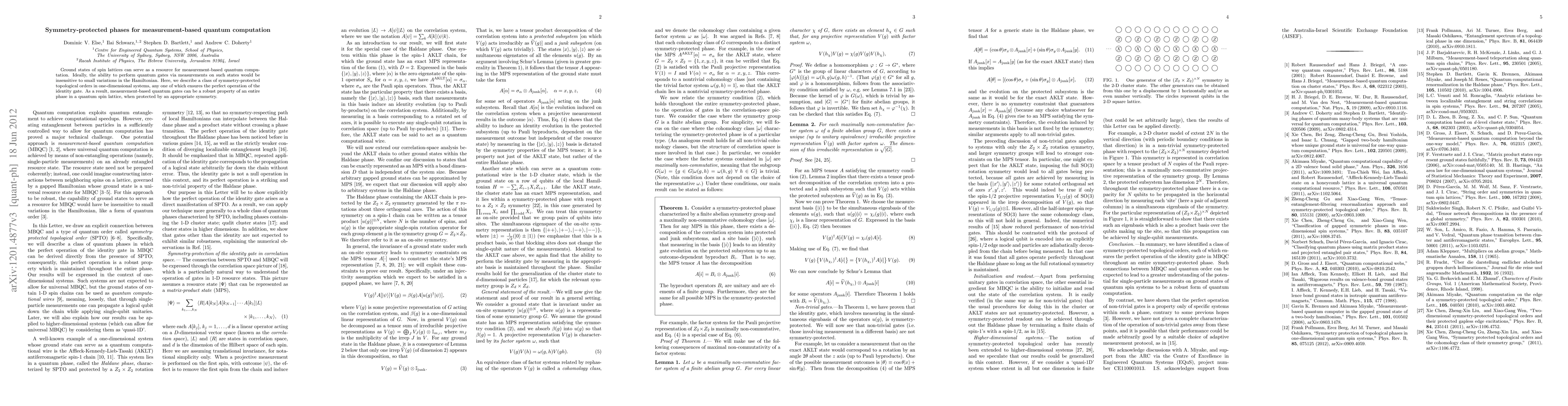 Ground states of spin lattices can serve as a resource for measurement-based quantum computation. Ideally, the ability to perform quantum gates via measurements on such states would be insensitive to small variations in the Hamiltonian. Here, we describe a class of symmetry-protected topological orders in one-dimensional systems, any one of which ensures the perfect operation of the identity gate. As a result, measurement-based quantum gates can be a robust property of an entire phase in a quantum spin lattice, when protected by an appropriate symmetry.