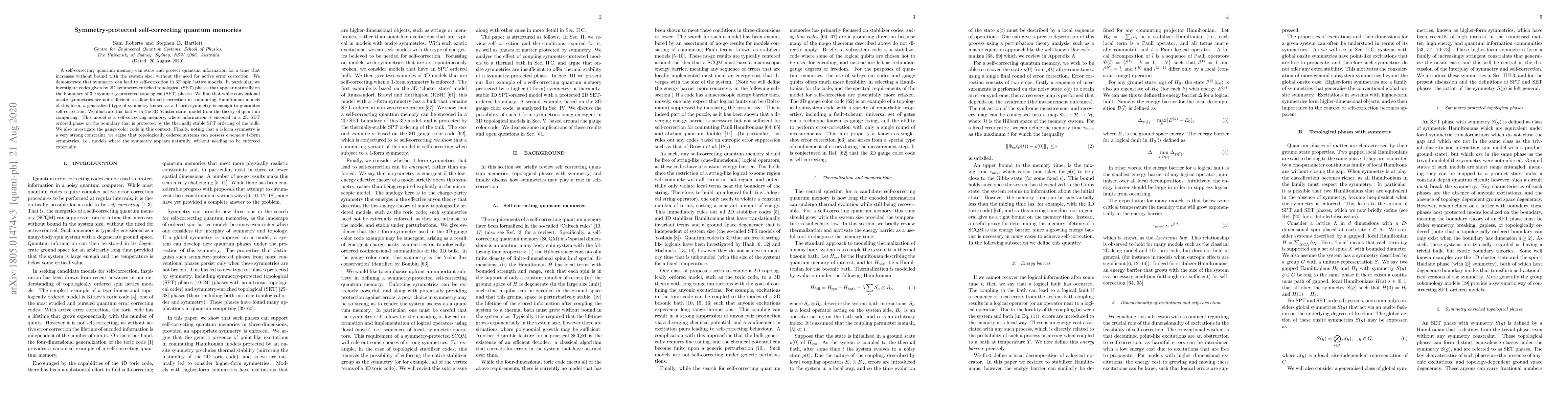 This paper demonstrates that symmetry-protected quantum memories can self-correct without active error correction, showing that 1-form symmetries enable self-correction in 3D spin-lattice models. The study highlights the "cluster-state" model as an example where a 2D symmetry-enriched topological phase on the boundary protects information due to the bulk's symmetry-protected topological order.