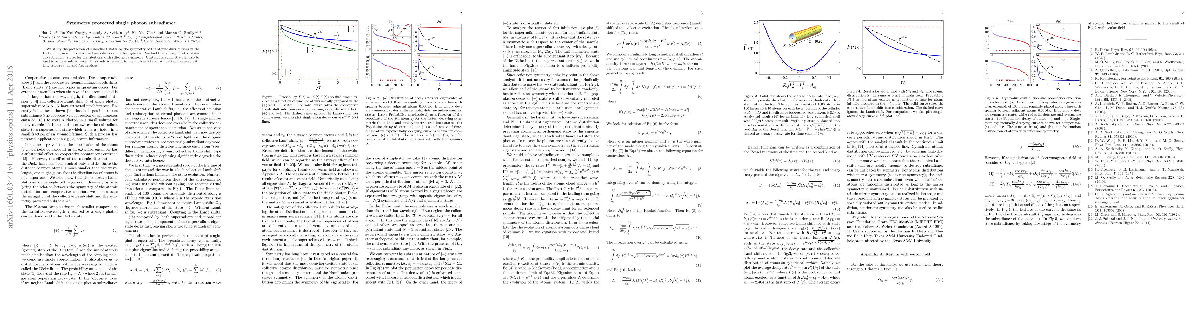 This paper investigates how symmetry in atomic distributions protects subradiant states in the Dicke limit, revealing that anti-symmetric states are inherently subradiant under reflection symmetry. The findings are significant for developing robust quantum memory with extended storage and rapid readout capabilities.