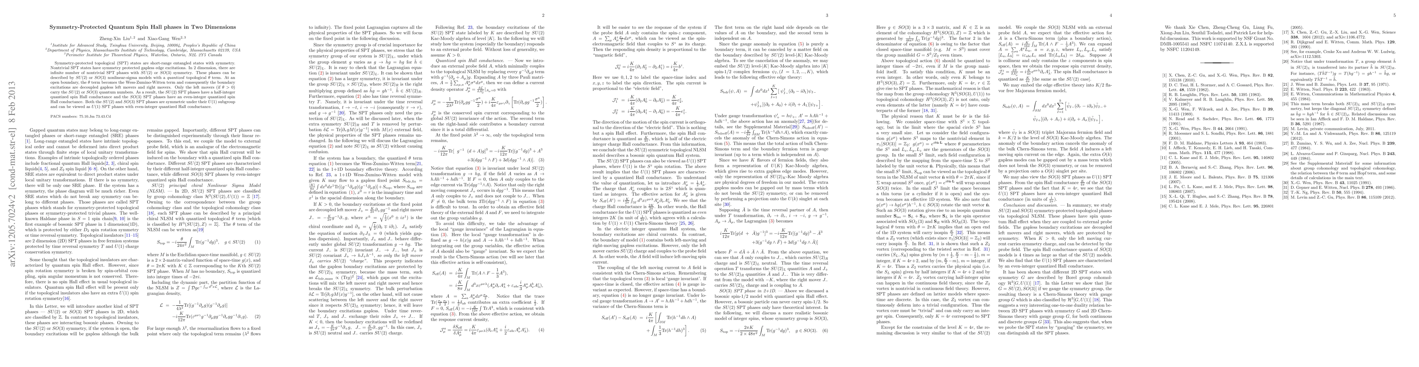 This paper explores symmetry protected topological (SPT) phases in 2D with SU(2) or SO(3) symmetry, characterized by quantized topological θ-terms. These phases exhibit gapless edge excitations, with left movers carrying SU(2)/SO(3) quantum numbers, resulting in half-integer or even-integer quantized spin Hall conductance respectively.