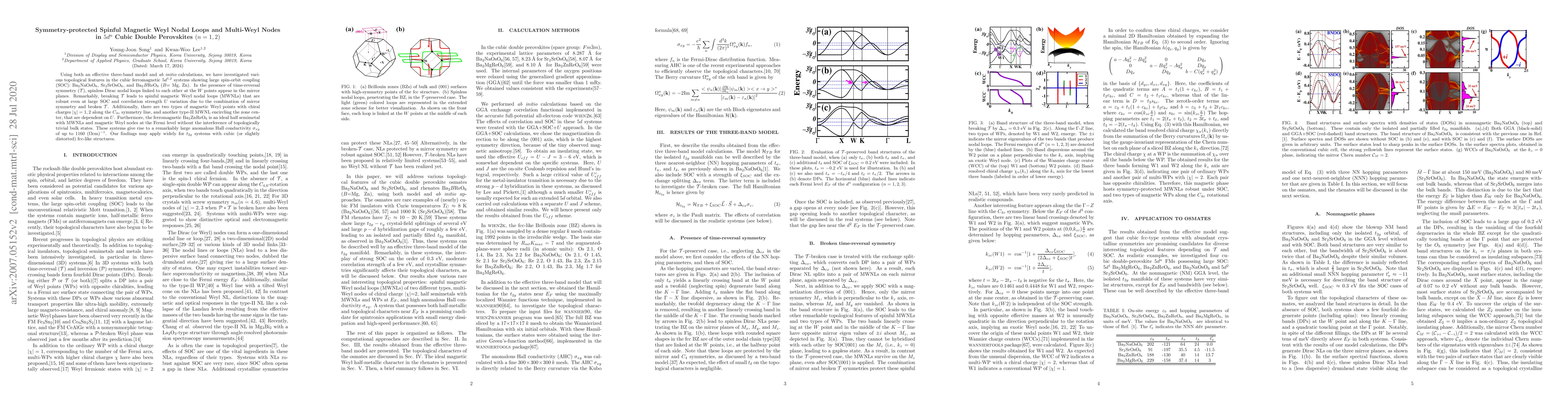 Using both an effective three-band model and {\it ab initio} calculations, we have investigated various topological features in the cubic ferromagnetic $5d^{1,2}$ systems showing large spin-orbit coupling (SOC): Ba$_2$NaOsO$_6$, Sr$_2$SrOsO$_6$, and Ba$_2$$B$ReO$_6$ ($B$= Mg, Zn). In the presence of time-reversal symmetry (${\cal T}$), spinless Dirac nodal loops linked to each other at the $W$ points appear in the mirror planes. Remarkably, breaking ${\cal T}$ leads to spinful magnetic Weyl nodal loops (MWNLs) that are robust even at large SOC and correlation strength $U$ variation due to the combination of mirror symmetry and broken ${\cal T}$. Additionally, there are two types of magnetic Weyl points with chiral charges $|\chi|=1, 2$ along the $C_{4v}$ symmetry line, and another type-II MWNL encircling the zone center, that are dependent on $U$. Furthermore, the ferromagnetic Ba$_2$ZnReO$_6$ is an ideal half semimetal with MWNLs and magnetic Weyl nodes at the Fermi level without the interference of topologically trivial bulk states. These systems give rise to a remarkably large anomalous Hall conductivity $\sigma_{xy}$ of up to 1160 ($\Omega$cm)$^{-1}$. Our findings may apply widely for $t_{2g}$ systems with cubic (or slightly distorted) fcc-like structures.