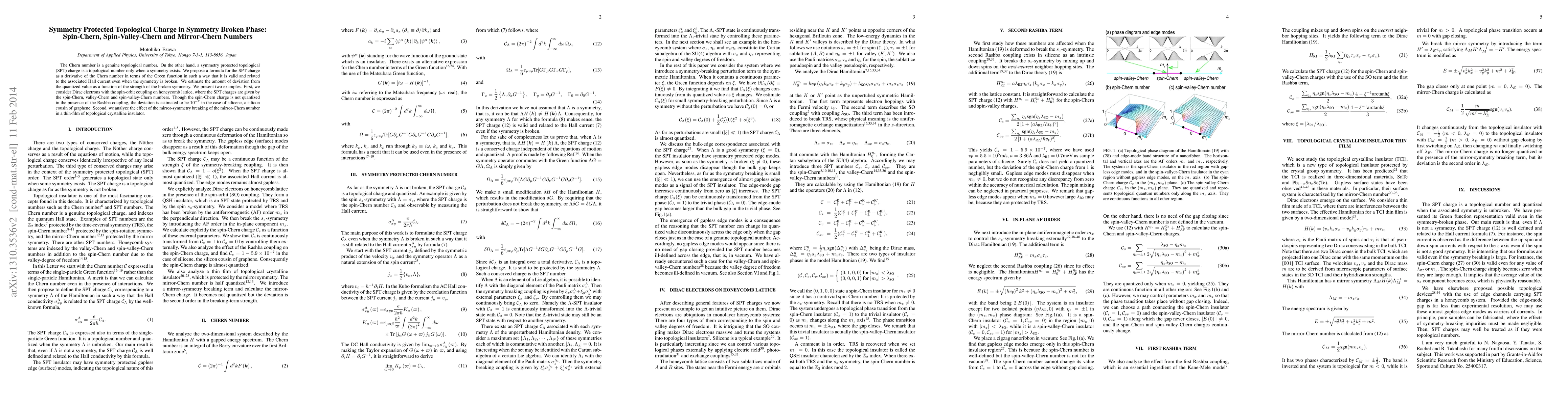 This paper proposes a formula for symmetry protected topological charges in symmetry-broken phases, relating them to Chern numbers via the Green function. It demonstrates that these charges, such as spin-Chern, valley-Chern, and spin-valley-Chern numbers in Dirac electrons on a honeycomb lattice, still retain quantifiable deviation even when symmetry is broken, as shown in examples like silicene and topological crystalline insulators.