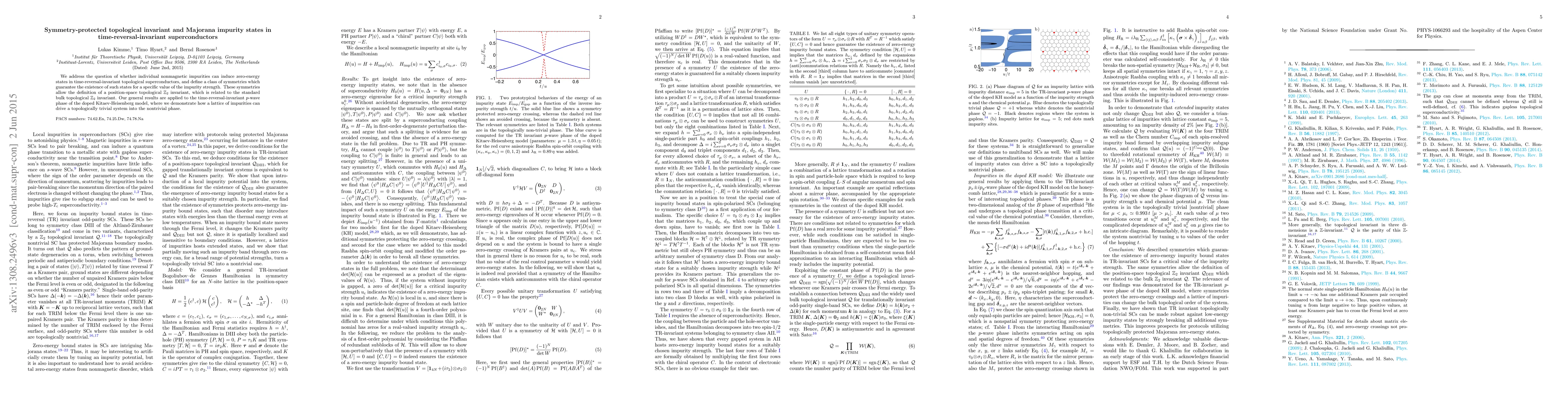 This paper explores how nonmagnetic impurities can create zero-energy states in time-reversal-invariant topological superconductors, defining a symmetry-protected topological invariant. It applies these findings to the p-wave phase of the doped Kitaev-Heisenberg model, demonstrating impurity-induced topological phase transitions.