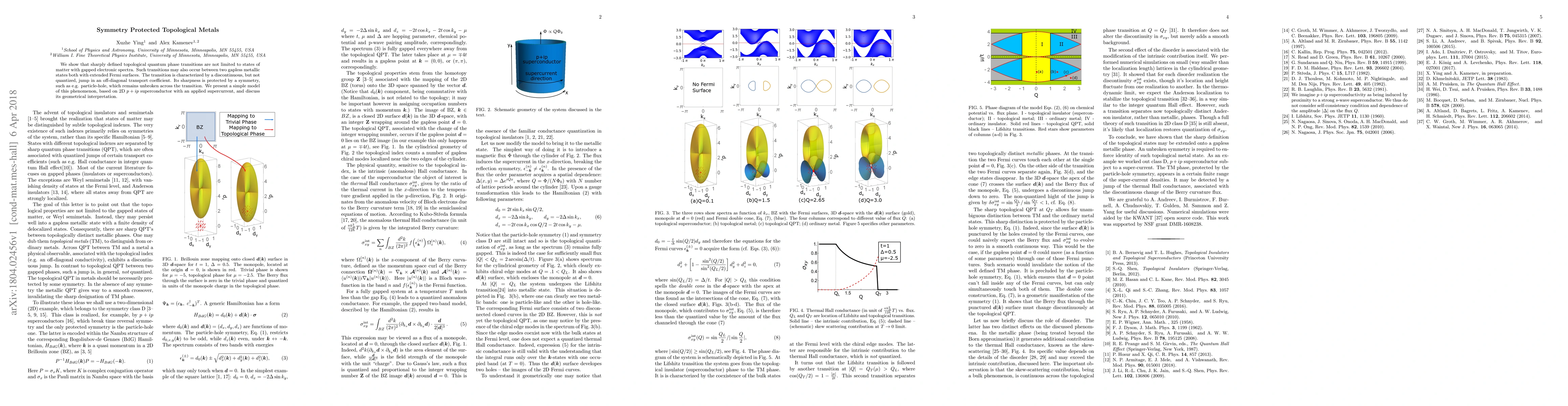 We show that sharply defined topological quantum phase transitions are not limited to states of matter with gapped electronic spectra. Such transitions may also occur between two gapless metallic states both with extended Fermi surfaces. The transition is characterized by a discontinuous, but not quantized, jump in an off-diagonal transport coefficient. Its sharpness is protected by a symmetry, such as e.g. particle-hole, which remains unbroken across the transition. We present a simple model of this phenomenon, based on 2D $p+ip$ superconductor with an applied supercurrent, and discuss its geometrical interpretation.