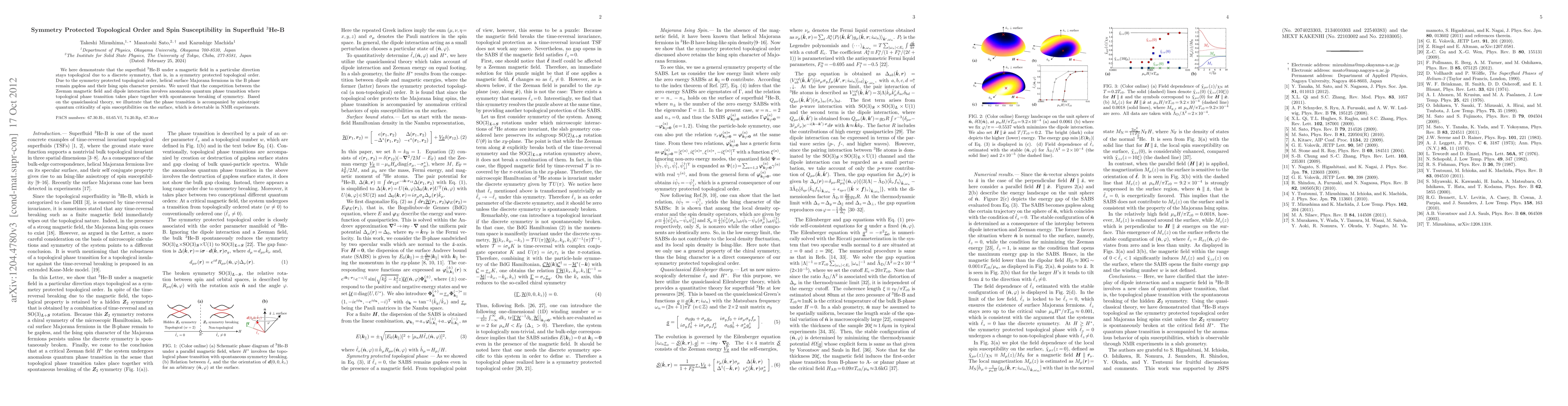 We here demonstrate that the superfluid 3He-B under a magnetic field in a particular direction stays topological due to a discrete symmetry, that is, in a symmetry protected topological order. Due to the symmetry protected topological order, helical surface Majorana fermions in the B phase remain gapless and their Ising spin character persists. We unveil that the competition between the Zeeman magnetic field and dipole interaction involves anomalous quantum phase transition where topological phase transition takes place together with spontaneous breaking of symmetry. Based on the quasiclassical theory, we illustrate that the phase transition is accompanied by anisotropic quantum criticality of spin susceptibilities on the surface, which is detectable in NMR experiments.