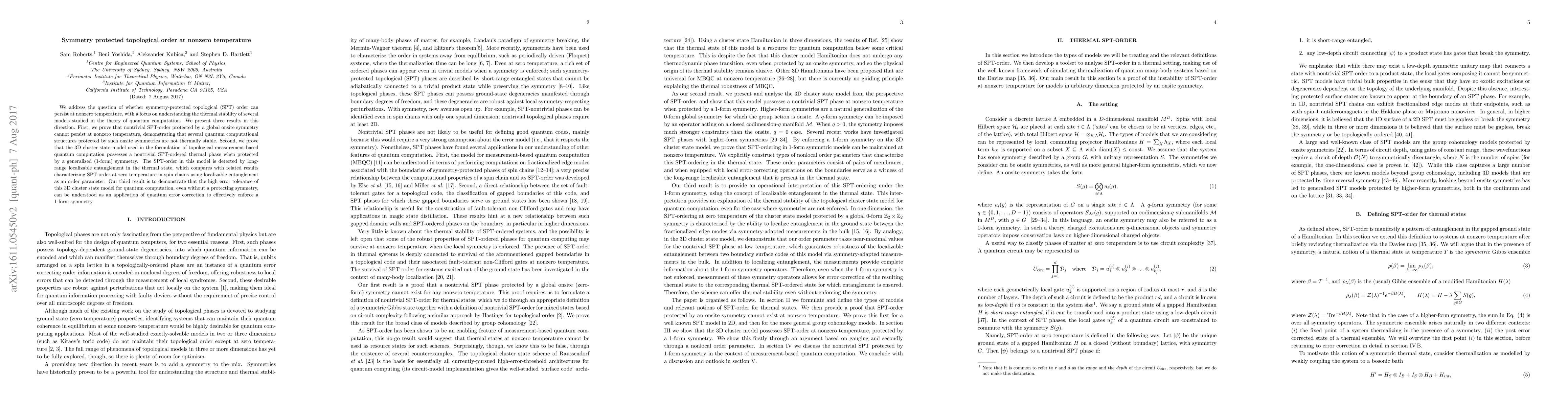 This paper investigates the thermal stability of symmetry-protected topological (SPT) order, demonstrating that SPT order protected by global on-site symmetries cannot persist at nonzero temperatures. It shows that a 3D cluster state model for quantum computation retains nontrivial SPT order when protected by a global generalized symmetry, detected by long-range entanglement, and explains high error tolerance in the model via quantum error correction.