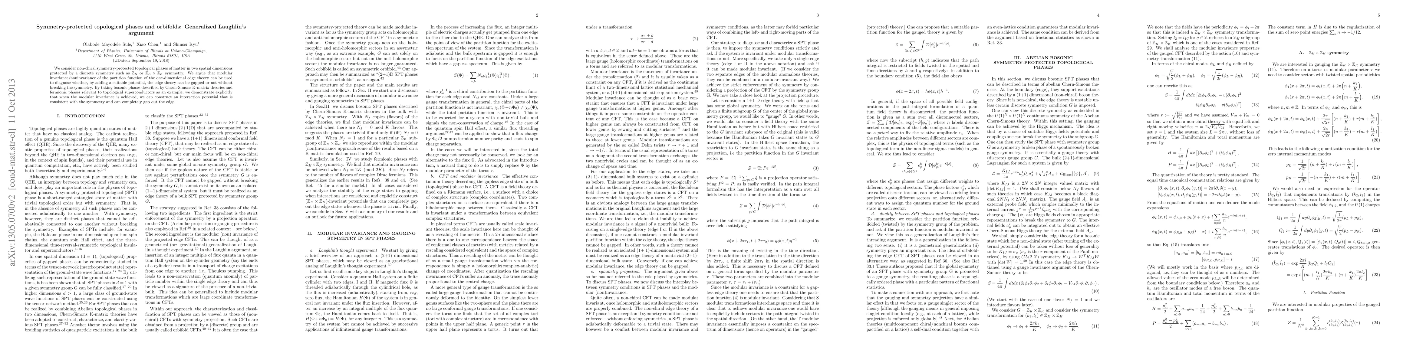 This paper investigates non-chiral symmetry-protected topological phases in 2D matter, focusing on $\mathbb{Z}_K$ symmetries. It proposes using modular invariance of edge theory's partition function to determine if the edge can be gapped via a symmetry-preserving potential, demonstrating this with Chern-Simons K-matrix and topological superconductor models.