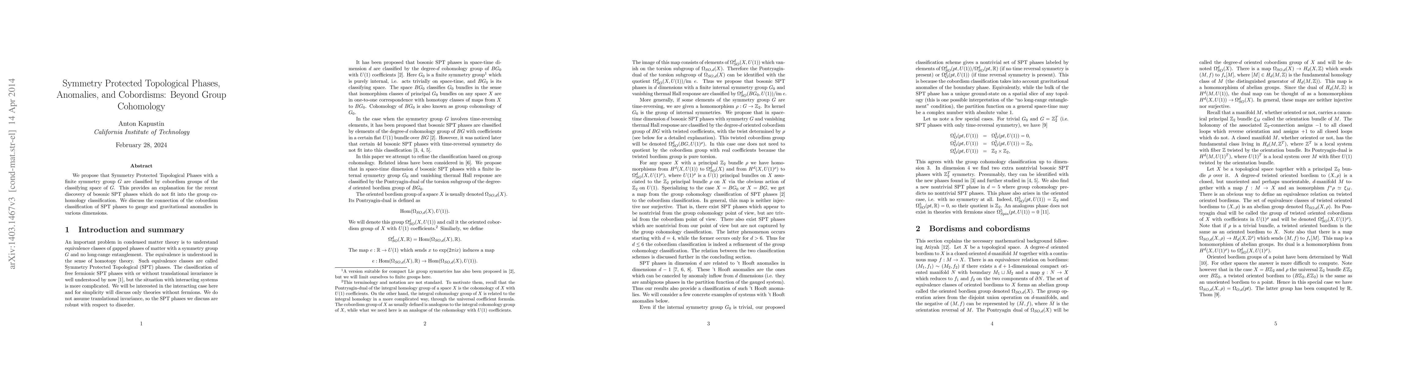 This paper proposes that Symmetry Protected Topological (SPT) phases with finite symmetry group G are classified by cobordism groups of G's classifying space, offering a new classification beyond group cohomology, and connects this to gauge and gravitational anomalies.