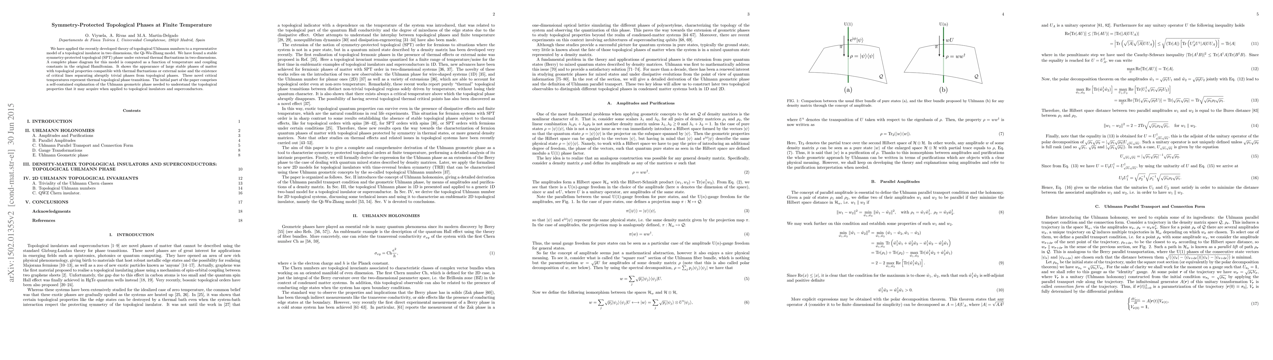 We have applied the recently developed theory of topological Uhlmann numbers to a representative model of a topological insulator in two dimensions, the Qi-Wu-Zhang model. We have found a stable symmetry-protected topological (SPT) phase under external thermal fluctuations in two-dimensions. A complete phase diagram for this model is computed as a function of temperature and coupling constants in the original Hamiltonian. It shows the appearance of large stable phases of matter with topological properties compatible with thermal fluctuations or external noise and the existence of critical lines separating abruptly trivial phases from topological phases. These novel critical temperatures represent thermal topological phase transitions. The initial part of the paper comprises a self-contained explanation of the Uhlmann geometric phase needed to understand the topological properties that it may acquire when applied to topological insulators and superconductors.