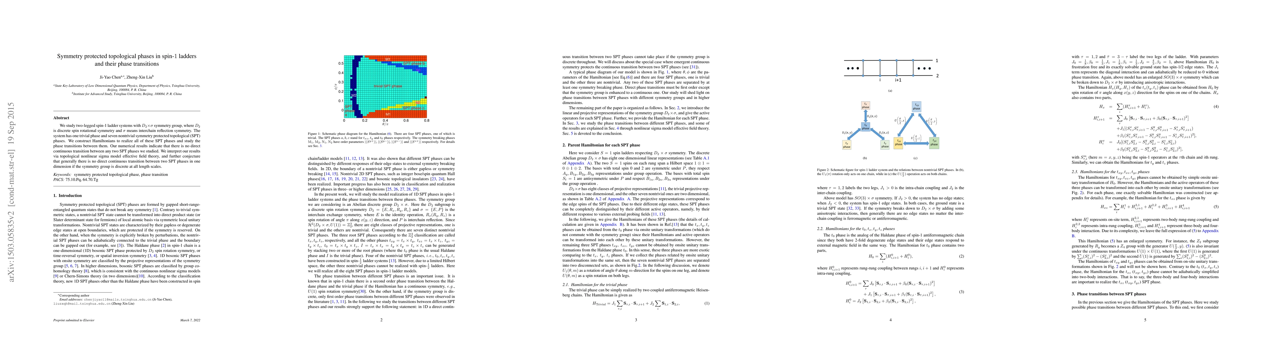 This paper investigates spin-1 ladder systems with $D_2\times \sigma$ symmetry, identifying one trivial and seven nontrivial SPT phases, and finds no direct continuous transitions between SPT phases, suggesting a general rule for such transitions in one-dimensional systems with discrete symmetries.