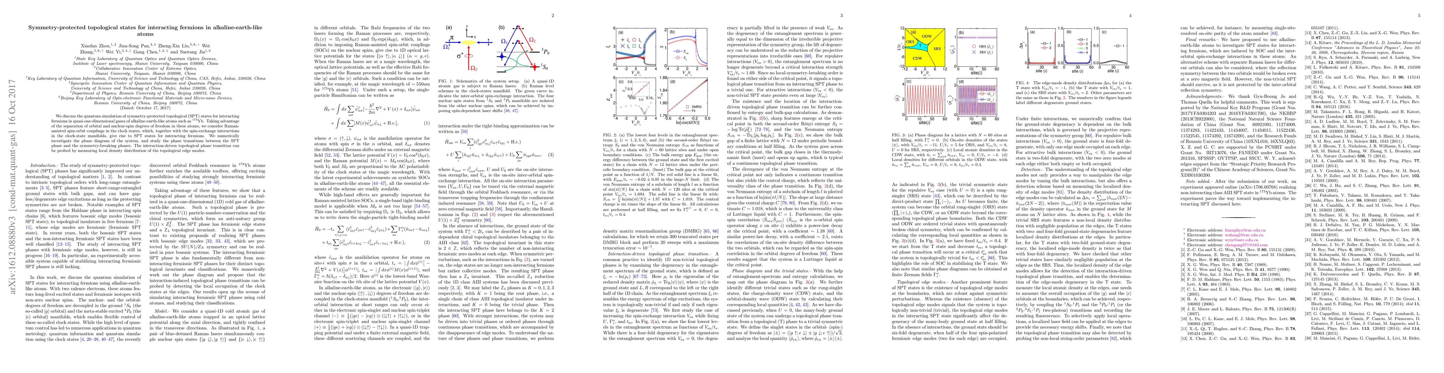 We discuss the quantum simulation of symmetry-protected topological (SPT) states for interacting fermions in quasi-one-dimensional gases of alkaline-earth-like atoms such as $^{173}$Yb. Taking advantage of the separation of orbital and nuclear-spin degrees of freedom in these atoms, we consider Raman-assisted spin-orbit couplings in the clock states, which, together with the spin-exchange interactions in the clock-state manifolds, give rise to SPT states for interacting fermions. We numerically investigate the phase diagram of the system, and study the phase transitions between the SPT phase and the symmetry-breaking phases. The interaction-driven topological phase transition can be probed by measuring local density distribution of the topological edge modes.