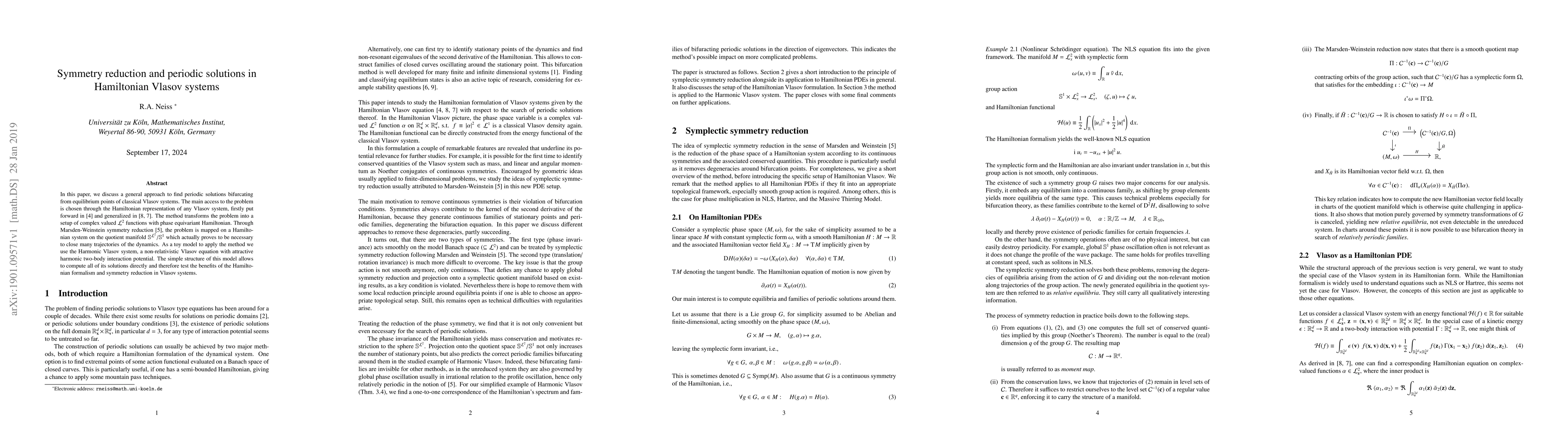 In this paper, we discuss a general approach to find periodic solutions bifurcating from equilibrium points of classical Vlasov systems. The main access to the problem is chosen through the Hamiltonian representation of any Vlasov system, firstly put forward by Fr\"ohlich, Knowles, and Schwarz, and generalized more recently by the author. The method transforms the problem into a setup of complex valued $\mathcal{L}^2$ functions with phase equivariant Hamiltonian. Through Marsden-Weinstein symmetry reduction, the problem is mapped on a Hamiltonian system on the quotient manifold $\mathbb{S}^{\mathcal{L}^2}/\mathbb{S}^1$ which actually proves to be necessary to close many trajectories of the dynamics. As a toy model to apply the method we use the Harmonic Vlasov system, a non-relativistic Vlasov equation with attractive harmonic two-body interaction potential. The simple structure of this model allows to compute all of its solutions directly and therefore test the benefits of the Hamiltonian formalism and symmetry reduction in Vlasov systems.