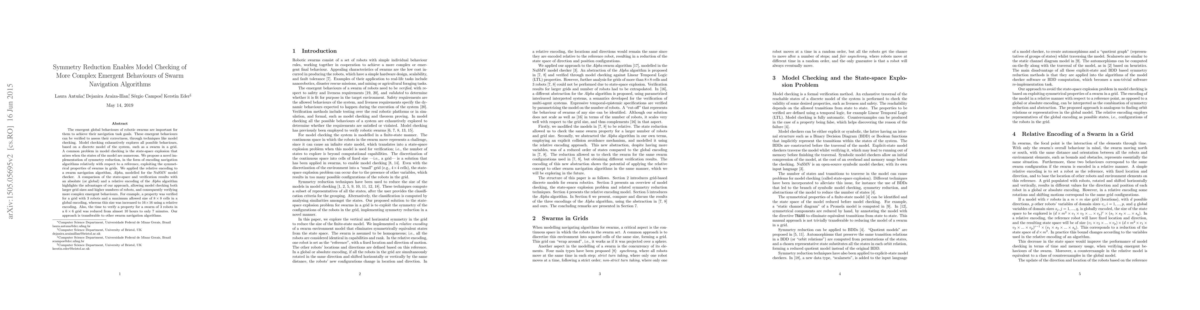 This paper proposes a symmetry reduction technique to enable model checking of complex emergent behaviours in swarm navigation algorithms, significantly reducing the state-space and verification time. The relative encoding method allows for larger grid sizes and more robots to be verified compared to traditional global encoding methods.
