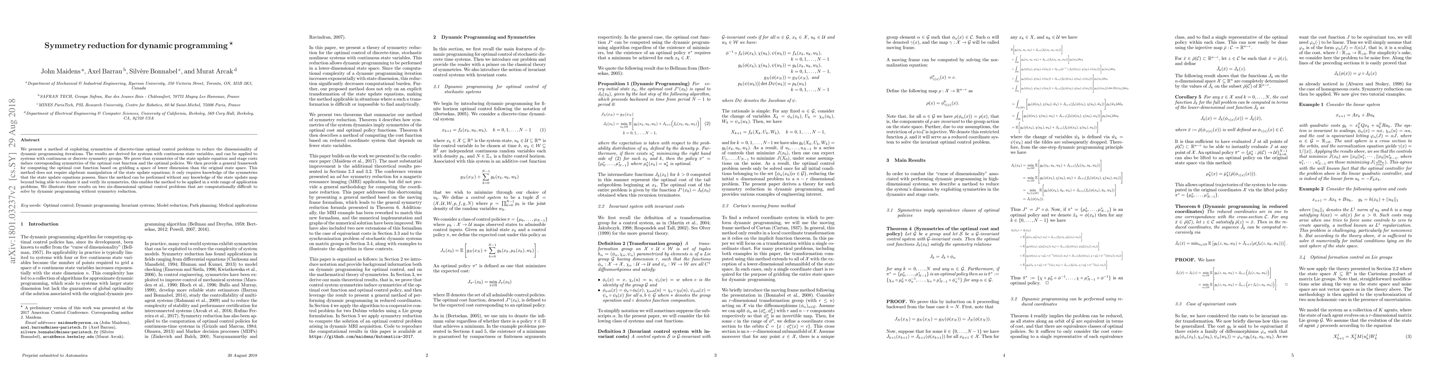 We present a method of exploiting symmetries of discrete-time optimal control problems to reduce the dimensionality of dynamic programming iterations. The results are derived for systems with continuous state variables, and can be applied to systems with continuous or discrete symmetry groups. We prove that symmetries of the state update equation and stage costs induce corresponding symmetries of the optimal cost function and the optimal policies. We then provide a general framework for computing the optimal cost function based on gridding a space of lower dimension than the original state space. This method does not require algebraic manipulation of the state update equations; it only requires knowledge of the symmetries that the state update equations possess. Since the method can be performed without any knowledge of the state update map beyond being able to evaluate it and verify its symmetries, this enables the method to be applied in a wide range of application problems. We illustrate these results on two six-dimensional optimal control problems that are computationally difficult to solve by dynamic programming without symmetry reduction.