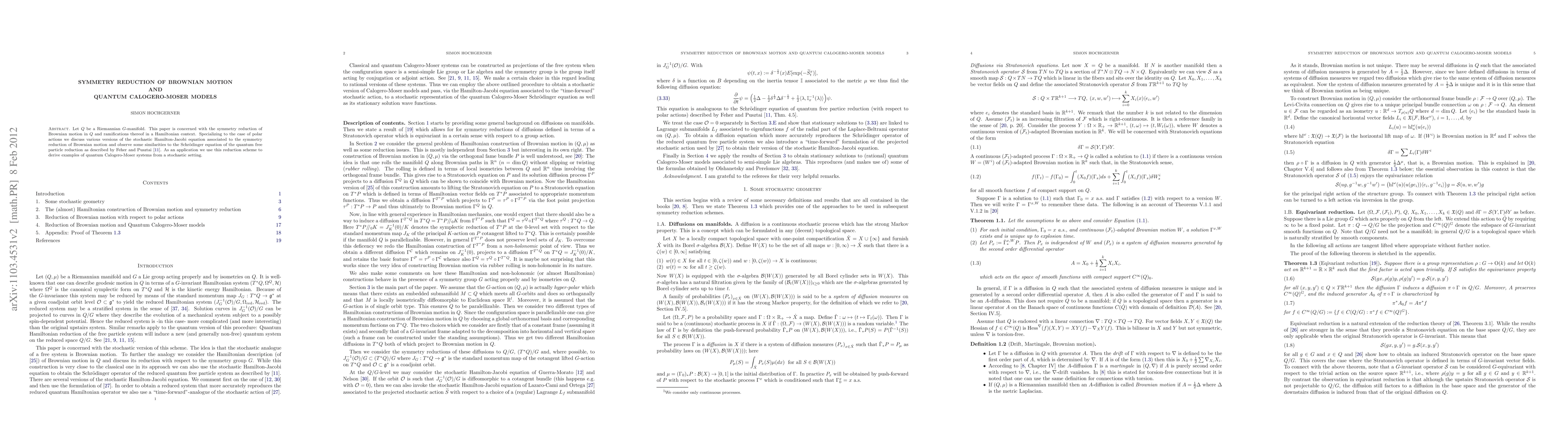 This paper explores the symmetry reduction of Brownian motion on a Riemannian $G$-manifold $Q$ and its implications in Hamiltonian dynamics, drawing parallels to the Schrödinger equation of quantum systems. It applies this reduction to derive quantum Calogero-Moser systems from a stochastic perspective.