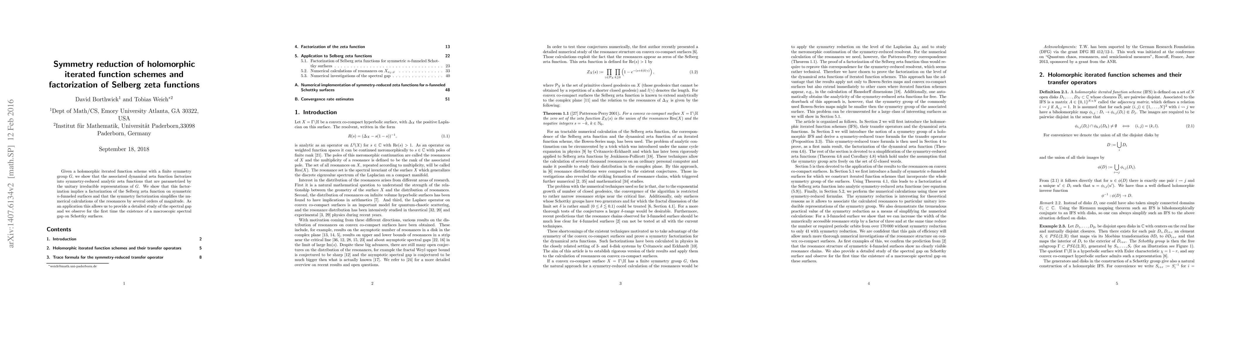 Given a holomorphic iterated function scheme with a finite symmetry group $G$, we show that the associated dynamical zeta function factorizes into symmetry-reduced analytic zeta functions that are parametrized by the unitary irreducible representations of $G$. We show that this factorization implies a factorization of the Selberg zeta function on symmetric $n$-funneled surfaces and that the symmetry factorization simplifies the numerical calculations of the resonances by several orders of magnitude. As an application this allows us to provide a detailed study of the spectral gap and we observe for the first time the existence of a macroscopic spectral gap on Schottky surfaces.