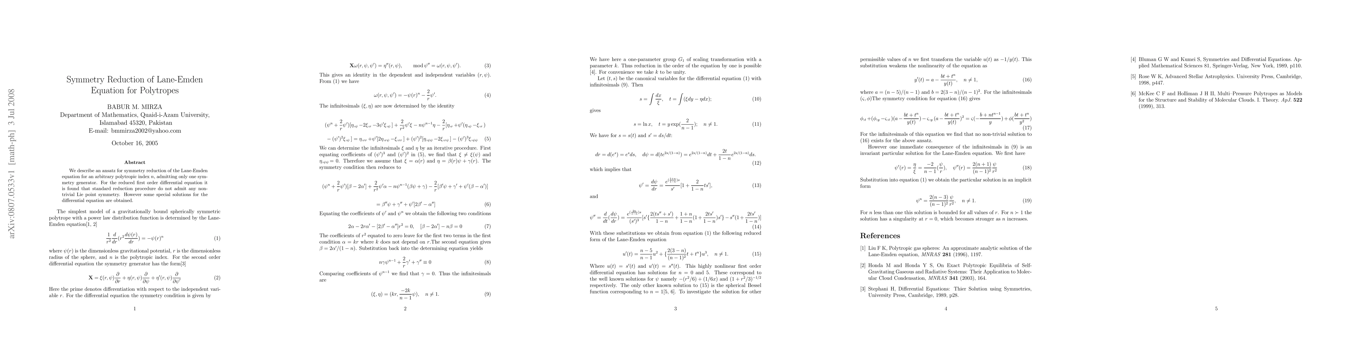 This paper proposes an ansatz for reducing the symmetry of the Lane-Emden equation for polytropes, finding that standard reduction methods do not yield non-trivial Lie point symmetries, but special solutions can still be derived.