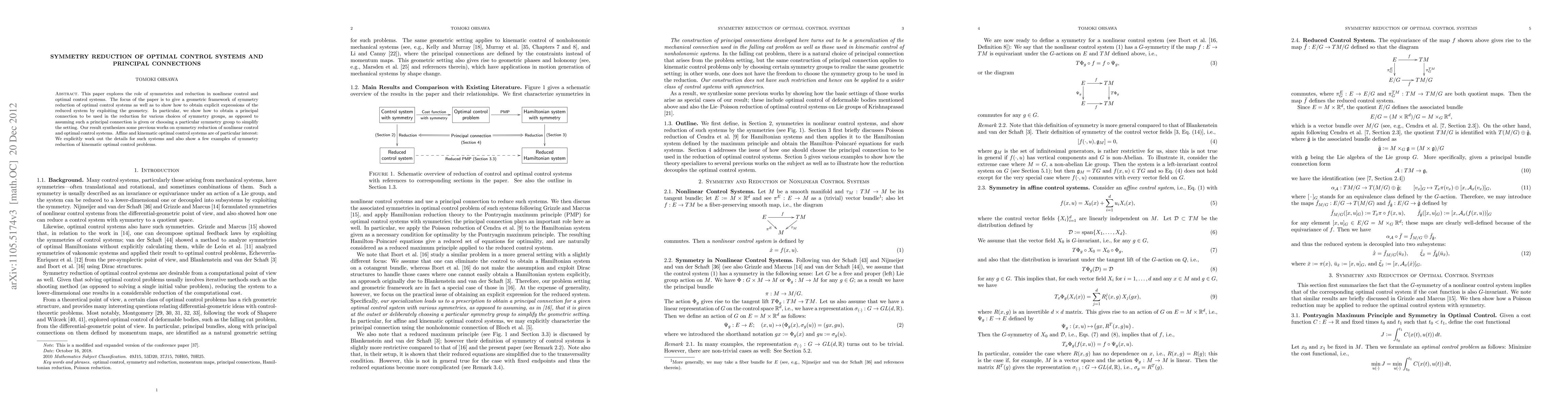 This paper provides a geometric framework for symmetry reduction in optimal control systems, demonstrating how to derive explicit expressions of reduced systems by leveraging the underlying geometry. It introduces a method for obtaining principal connections for various symmetry groups, synthesizing previous works on symmetry reduction in nonlinear control systems.