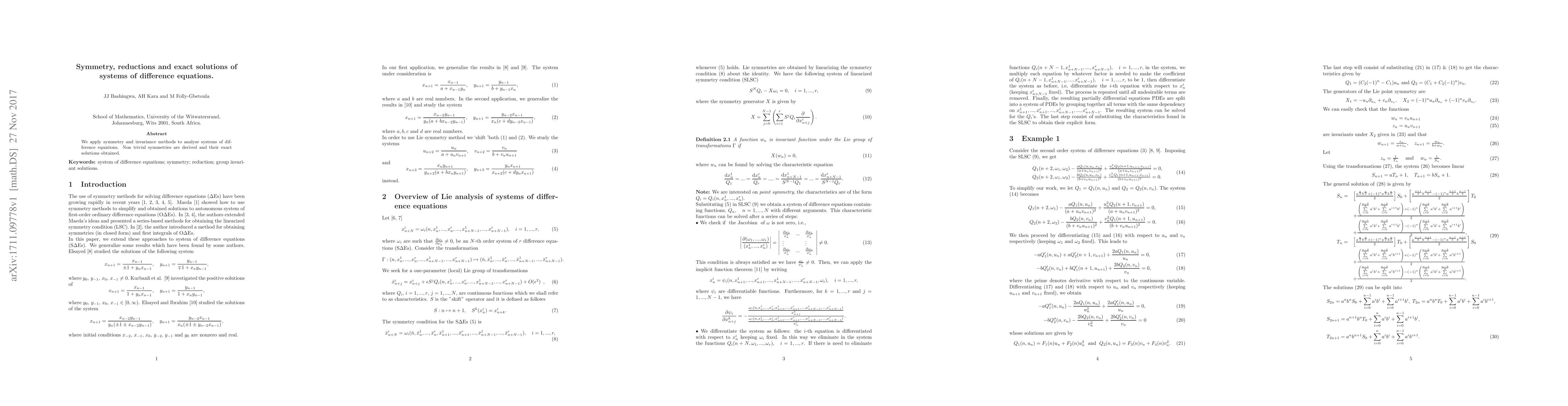 We apply symmetry and invariance methods to analyse systems of difference equations. Non trivial symmetries are derived and their exact solutions obtained.