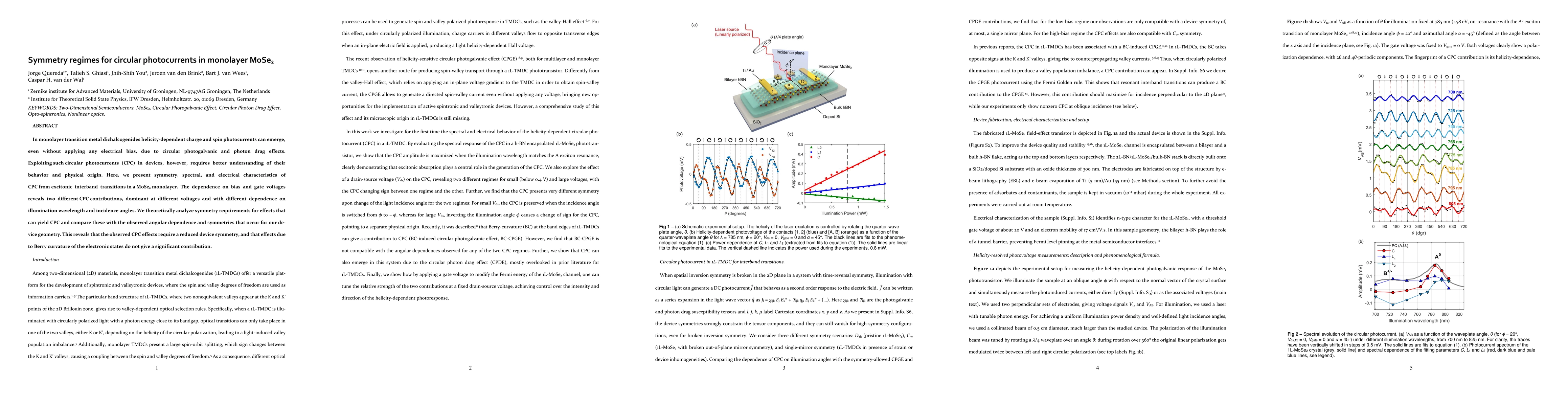 Researchers studied circular photocurrents in a monolayer MoSe2 material, discovering two distinct contributions with different dependencies on bias, gate voltages, wavelength, and incidence angles. The findings suggest the material's reduced symmetry is necessary for these effects to occur.