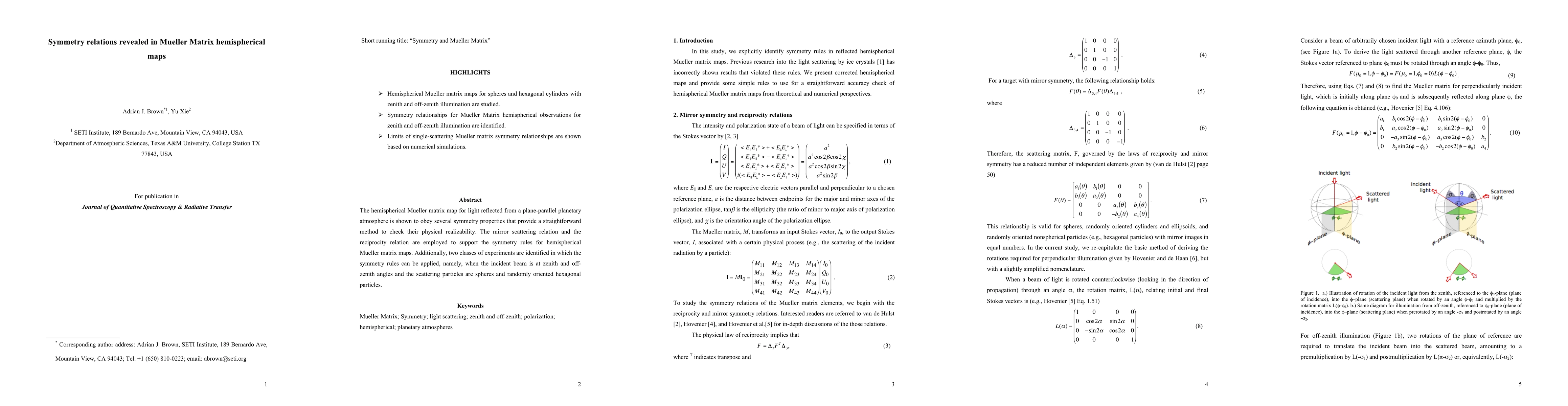 This paper reveals symmetry properties in hemispherical Mueller matrix maps for light reflected from planetary atmospheres, using mirror scattering and reciprocity relations. The findings apply to experiments with incident beams at zenith and off-zenith angles, involving spherical and randomly oriented hexagonal scattering particles.